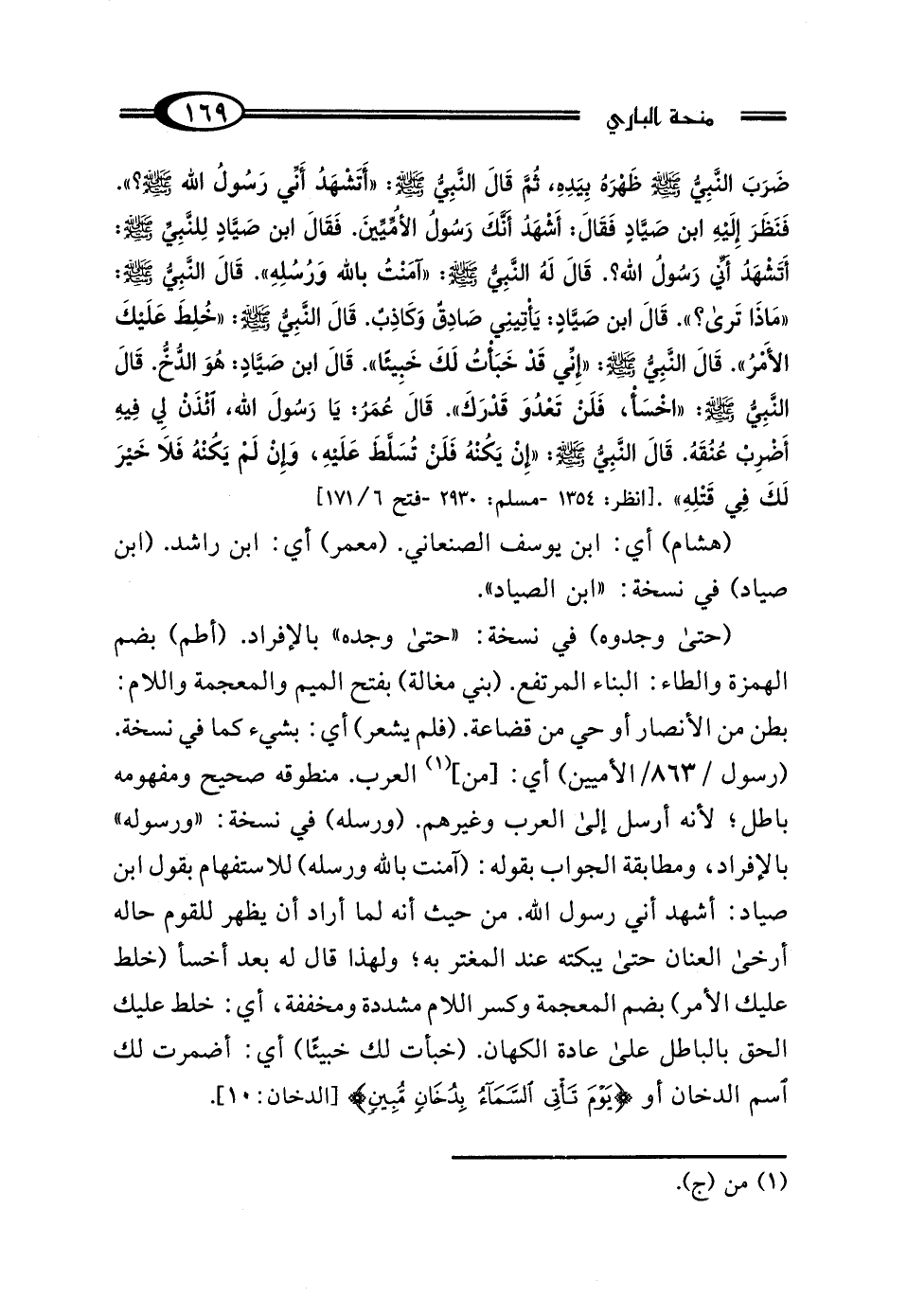 ضَرَبَ النَّبِيُّ صَلَّى اللهُ عَلَيْهِ وَسَلَّمَ ظَهْرَهُ بِيَدِهِ، ثُمَّ قَال النَّبِيُّ صَلَّى اللهُ عَلَيْهِ وَسَلَّمَ: "أَتَشْهَدُ أَنِّي رَسُولُ اللَّهِ؟ "، فَنَظَرَ إِلَيْهِ ابْنُ صَيَّادٍ، فَقَال: أَشْهَدُ أَنَّكَ رَسُولُ الأُمِّيِّينَ، فَقَال ابْنُ صَيَّادٍ لِلنَّبِيِّ صَلَّى اللهُ عَلَيْهِ وَسَلَّمَ: أَتَشْهَدُ أَنِّي رَسُولُ اللَّهِ؟ قَال لَهُ النَّبِيُّ صَلَّى اللهُ عَلَيْهِ وَسَلَّمَ: "آمَنْتُ بِاللَّهِ وَرُسُلِهِ"، قَال النَّبِيُّ صَلَّى اللهُ عَلَيْهِ وَسَلَّمَ: "مَاذَا تَرَى؟ " قَال ابْنُ صَيَّادٍ: يَأْتِينِي صَادِقٌ وَكَاذِبٌ، قَال النَّبِيُّ صَلَّى اللهُ عَلَيْهِ وَسَلَّمَ: "خُلِطَ عَلَيْكَ الأَمْرُ؟ " قَال النَّبِيُّ صَلَّى اللهُ عَلَيْهِ وَسَلَّمَ: "إِنِّي قَدْ خَبَأْتُ لَكَ خَبِيئًا"، قَال ابْنُ صَيَّادٍ: هُوَ الدُّخُّ، قَال النَّبِيُّ صَلَّى اللهُ عَلَيْهِ وَسَلَّمَ: "اخْسَأْ، فَلَنْ تَعْدُوَ قَدْرَكَ"، قَال عُمَرُ: يَا رَسُولَ اللَّهِ، ائْذَنْ لِي فِيهِ أَضْرِبْ عُنُقَهُ، قَال النَّبِيُّ صَلَّى اللهُ عَلَيْهِ وَسَلَّمَ: "إِنْ يَكُنْهُ، فَلَنْ تُسَلَّطَ عَلَيْهِ، وَإِنْ لَمْ يَكُنْهُ، فَلَا خَيْرَ لَكَ فِي قَتْلِهِ".