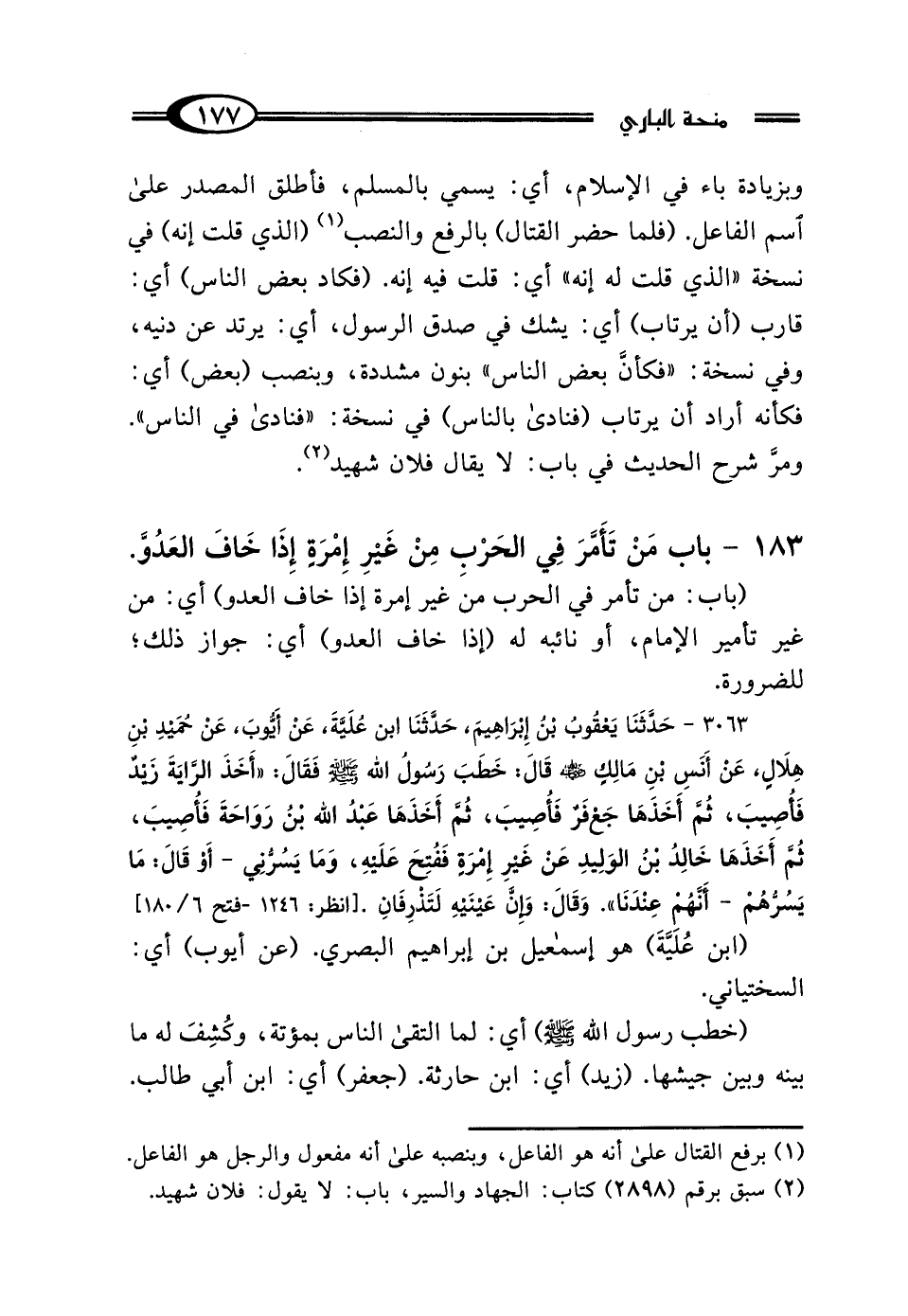 3063 - حَدَّثَنَا يَعْقُوبُ بْنُ إِبْرَاهِيمَ، حَدَّثَنَا ابْنُ عُلَيَّةَ، عَنْ أَيُّوبَ، عَنْ حُمَيْدِ بْنِ هِلالٍ، عَنْ أَنَسِ بْنِ مَالِكٍ رَضِيَ اللَّهُ عَنْهُ، قَال: خَطَبَ رَسُولُ اللَّهِ صَلَّى اللهُ عَلَيْهِ وَسَلَّمَ، فَقَال: "أَخَذَ الرَّايَةَ زَيْدٌ فَأُصِيبَ، ثُمَّ أَخَذَهَا جَعْفَرٌ فَأُصِيبَ، ثُمَّ أَخَذَهَا عَبْدُ اللَّهِ بْنُ رَوَاحَةَ فَأُصِيبَ، ثُمَّ أَخَذَهَا خَالِدُ بْنُ الوَلِيدِ عَنْ غَيْرِ إِمْرَةٍ فَفُتِحَ عَلَيْهِ، وَمَا يَسُرُّنِي، أَوْ قَال: مَا يَسُرُّهُمْ، أَنَّهُمْ عِنْدَنَا"، وَقَال وَإِنَّ عَيْنَيْهِ لَتَذْرِفَانِ.
