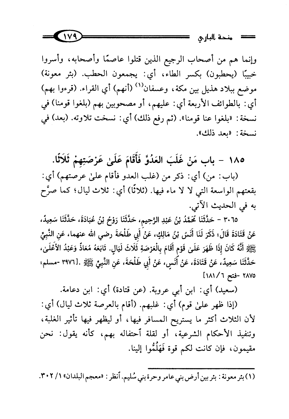 3065 - حَدَّثَنَا مُحَمَّدُ بْنُ عَبْدِ الرَّحِيمِ، حَدَّثَنَا رَوْحُ بْنُ عُبَادَةَ، حَدَّثَنَا سَعِيدٌ، عَنْ قَتَادَةَ، قَال: ذَكَرَ لَنَا أَنَسُ بْنُ مَالِكٍ عَنْ أَبِي طَلْحَةَ رَضِيَ اللَّهُ عَنْهُمَا، عَنِ النَّبِيِّ صَلَّى اللهُ عَلَيْهِ وَسَلَّمَ: "أَنَّهُ كَانَ إِذَا ظَهَرَ عَلَى قَوْمٍ أَقَامَ بِالعَرْصَةِ ثَلاثَ لَيَالٍ" تَابَعَهُ مُعَاذٌ، وَعَبْدُ الأَعْلَى، حَدَّثَنَا سَعِيدٌ، عَنْ قَتَادَةَ، عَنْ أَنَسٍ، عَنْ أَبِي طَلْحَةَ عَنِ النَّبِيِّ صَلَّى اللهُ عَلَيْهِ وَسَلَّمَ.