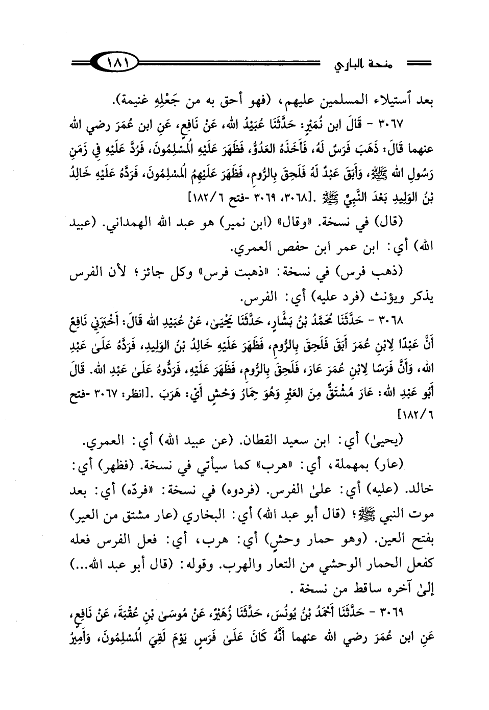 3067 - قَال ابْنُ نُمَيْرٍ، حَدَّثَنَا عُبَيْدُ اللَّهِ، عَنْ نَافِعٍ، عَنْ ابْنِ عُمَرَ رَضِيَ اللَّهُ عَنْهُمَا، قَال: ذَهَبَ فَرَسٌ لَهُ، فَأَخَذَهُ العَدُوُّ، فَظَهَرَ عَلَيْهِ المُسْلِمُونَ، فَرُدَّ عَلَيْهِ فِي زَمَنِ رَسُولِ اللَّهِ صَلَّى اللهُ عَلَيْهِ وَسَلَّمَ، وَأَبَقَ عَبْدٌ لَهُ فَلَحِقَ بِالرُّومِ، فَظَهَرَ عَلَيْهِمُ المُسْلِمُونَ، فَرَدَّهُ عَلَيْهِ خَالِدُ بْنُ الوَلِيدِ بَعْدَ النَّبِيِّ صَلَّى اللهُ عَلَيْهِ وَسَلَّمَ.