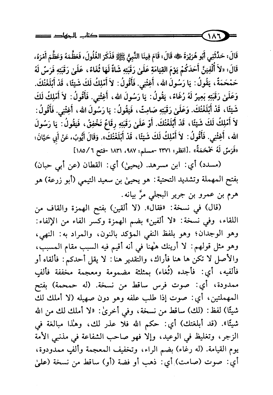 (قال) في نسخة: "فقال". (لا ألقين) بفتح الهمزة والقاف من اللقاء، وفي نسخة: "لا ألفين" بضم الهمزة وكسر الفاء من الإلفاء: وهو الوجدان، وهو بلفظ النفي المؤكد بالنون، والمراد به: النهي، وهو مثل قولهم: لا أرينك ها هنا في أنه أقيم فيه السبب مقام المسبب، والأصل لا تكن ها هنا فأراك، والتقدير هنا: لا يقل أحدكم: فألقاه أو فألفيه، أي: فأجده (ثُغاء) بمثلثة مضمومة ومعجمة مخففة فألفٍ ممدودة، أي: صوت فرس ساقط من نسخة. (له حمحمة) بفتح المهملتين، أي: صوت إذا طلب علفه وهو دون صهيله (لا أملك لك شيئًا) لفظ: (لك) ساقط من نسخة، وفي أخرى: "لا أملك لك من الله شيئًا". (قد أبلغتك) أي: حكم الله فلا عذر لك، وهذا مبالغة في الزجر، وتغليظ في الوعيد، وإلا فهو صاحب الشفاعة في مذنبي الأمة يوم القيامة. (له رغاء) بضم الراء، وتخفيف المعجمة وألفٍ ممدودوة، أي: صوت (صامت) أي: ذهب أو فضة (أو) ساقط من نسخة (على