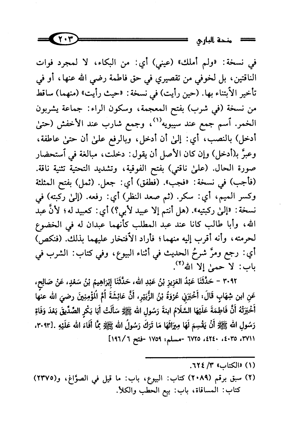 في نسخة: "ولم أملك" (عيني) أي: من البكاء، لا لمجرد فوات الناقتين، بل لخوفي من تقصيري في حق فاطمة رضي الله عنها، أو في تأخير الابتناء بها. (حين رأيت) في نسخة: "حيث رأيت" (منهما) ساقط من نسخة (في شرب) بفتح المعجمة، وسكون الراء: جماعة يشربون الخمر. اسم جمع عند سيبويه (¬1)، وجمع شارب عند الأخفش (حتى أدخل) بالنصب، أي: إلى أن أدخل، وبالرفع على أن حتى عاطفة، وعبَّر بـ (أدخل) وإن كان الأصل أن يقول: دخلت، مبالغة في استحضار صورة الحال. (على ناقتي) بفتح الفوقية، وتشديد التحتية تثنية ناقة. (فأجب) في نسخة: "فجب". (فطفق) أي: جعل. (ثمل) بفتح المثلثة وكسر الميم، أي: سكر. (ثم صعد النظر) أي: رفعه. (إلى ركبته) في نسخة: "إلى ركبتيه". (هل أنتم إلا عبيد لأبي؟) أي: كعبيد له: لأنَّ عبد الله، وأبا طالب كانا عند عبد المطلب كأنهما عبدان له في الخضوع لحرمته، وأنه أقرب إليه منهما؛ فأراد الافتخار عليهما بذلك. (فنكص) أي: رجع ومرَّ شرحُ الحديث في أثناء البيوع، وفي كتاب: الشرب في باب: لا حمى إلا الله (¬2).
