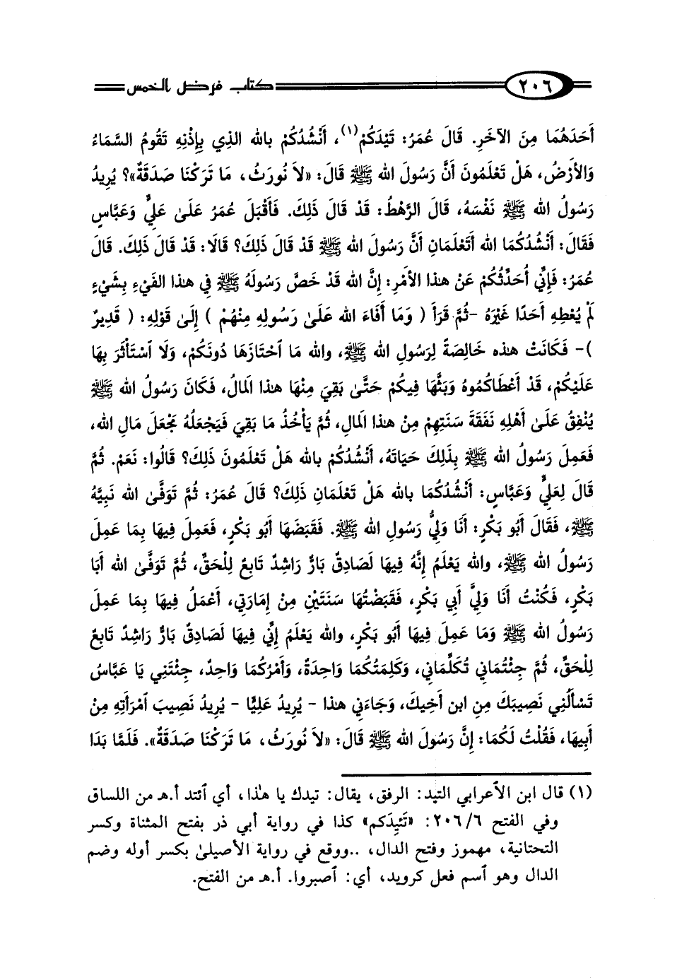 أَحَدَهُمَا مِنَ الآخَرِ، قَال عُمَرُ: تَيْدَكُمْ (¬1) أَنْشُدُكُمْ بِاللَّهِ الَّذِي بِإِذْنِهِ تَقُومُ السَّمَاءُ وَالأَرْضُ، هَلْ تَعْلَمُونَ أَنَّ رَسُولَ اللَّهِ صَلَّى اللهُ عَلَيْهِ وَسَلَّمَ، قَال: "لَا نُورَثُ مَا تَرَكْنَا صَدَقَةٌ" يُرِيدُ رَسُولُ اللَّهِ صَلَّى اللهُ عَلَيْهِ وَسَلَّمَ نَفْسَهُ؟ قَال الرَّهْطُ: قَدْ قَال: ذَلِكَ، فَأَقْبَلَ عُمَرُ عَلَى عَلِيٍّ، وَعَبَّاسٍ، فَقَال: أَنْشُدُكُمَا اللَّهَ، أَتَعْلَمَانِ أَنَّ رَسُولَ اللَّهِ صَلَّى اللهُ عَلَيْهِ وَسَلَّمَ قَدْ قَال ذَلِكَ؟ قَالا: قَدْ قَال ذَلِكَ، قَال عُمَرُ: فَإِنِّي أُحَدِّثُكُمْ عَنْ هَذَا الأَمْرِ، إِنَّ اللَّهَ قَدْ خَصَّ رَسُولَهُ صَلَّى اللهُ عَلَيْهِ وَسَلَّمَ فِي هَذَا الفَيْءِ بِشَيْءٍ لَمْ يُعْطِهِ أَحَدًا غَيْرَهُ، ثُمَّ قَرَأَ: {وَمَا أَفَاءَ اللَّهُ عَلَى رَسُولِهِ مِنْهُمْ} [الحشر: 6]- إِلَى قَوْلِهِ - {قَدِيرٌ} [الحشر: 6]، فَكَانَتْ هَذِهِ خَالِصَةً لِرَسُولِ اللَّهِ صَلَّى اللهُ عَلَيْهِ وَسَلَّمَ، وَاللَّهِ مَا احْتَازَهَا دُونَكُمْ، وَلَا اسْتَأْثَرَ بِهَا عَلَيْكُمْ، قَدْ أَعْطَاكُمُوهَا وَبَثَّهَا فِيكُمْ، حَتَّى بَقِيَ مِنْهَا هَذَا المَالُ، فَكَانَ رَسُولُ اللَّهِ صَلَّى اللهُ عَلَيْهِ وَسَلَّمَ يُنْفِقُ عَلَى أَهْلِهِ نَفَقَةَ سَنَتِهِمْ مِنْ هَذَا المَالِ، ثُمَّ يَأْخُذُ مَا بَقِيَ، فَيَجْعَلُهُ مَجْعَلَ مَالِ اللَّهِ، فَعَمِلَ رَسُولُ اللَّهِ صَلَّى اللهُ عَلَيْهِ وَسَلَّمَ بِذَلِكَ حَيَاتَهُ، أَنْشُدُكُمْ بِاللَّهِ، هَلْ تَعْلَمُونَ ذَلِكَ؟ قَالُوا: نَعَمْ، ثُمَّ قَال لِعَلِيٍّ، وَعَبَّاسٍ، أَنْشُدُكُمَا بِاللَّهِ، هَلْ تَعْلَمَانِ ذَلِكَ؟ قَال عُمَرُ: ثُمَّ تَوَفَّى اللَّهُ نَبِيَّهُ صَلَّى اللهُ عَلَيْهِ وَسَلَّمَ، فَقَال أَبُو بَكْرٍ: أَنَا وَلِيُّ رَسُولِ اللَّهِ صَلَّى اللهُ عَلَيْهِ وَسَلَّمَ، فَقَبَضَهَا أَبُو بَكْرٍ، فَعَمِلَ فِيهَا بِمَا عَمِلَ رَسُولُ اللَّهِ صَلَّى اللهُ عَلَيْهِ وَسَلَّمَ، وَاللَّهُ يَعْلَمُ: إِنَّهُ فِيهَا لَصَادِقٌ بَارٌّ رَاشِدٌ تَابِعٌ لِلْحَقِّ، ثُمَّ تَوَفَّى اللَّهُ أَبَا بَكْرٍ، فَكُنْتُ أَنَا وَلِيَّ أَبِي بَكْرٍ، فَقَبَضْتُهَا سَنَتَيْنِ مِنْ إِمَارَتِي، أَعْمَلُ فِيهَا بِمَا عَمِلَ رَسُولُ اللَّهِ صَلَّى اللهُ عَلَيْهِ وَسَلَّمَ، وَمَا عَمِلَ فِيهَا أَبُو بَكْرٍ، وَاللَّهُ يَعْلَمُ: إِنِّي فِيهَا لَصَادِقٌ بَارٌّ رَاشِدٌ تَابِعٌ لِلْحَقِّ، ثُمَّ جِئْتُمَانِي تُكَلِّمَانِي، وَكَلِمَتُكُمَا وَاحِدَةٌ، وَأَمْرُكُمَا وَاحِدٌ، جِئْتَنِي يَا عَبَّاسُ، تَسْأَلُنِي نَصِيبَكَ مِنَ ابْنِ أَخِيكَ، وَجَاءَنِي هَذَا - يُرِيدُ عَلِيًّا - يُرِيدُ نَصِيبَ امْرَأَتِهِ مِنْ أَبِيهَا، فَقُلْتُ لَكُمَا: إِنَّ رَسُولَ اللَّهِ صَلَّى اللهُ عَلَيْهِ وَسَلَّمَ قَال: "لَا نُورَثُ، مَا تَرَكْنَا صَدَقَةٌ"، فَلَمَّا بَدَا