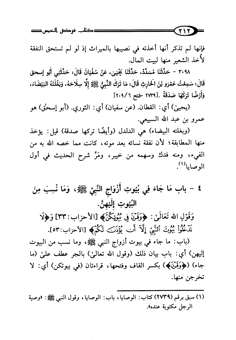 وَقَوْلِ اللَّهِ تَعَالى: {وَقَرْنَ فِي بُيُوتِكُنَّ} [الأحزاب: 33] وَ {لَا تَدْخُلُوا بُيُوتَ النَّبِيِّ إلا أَنْ يُؤْذَنَ لَكُمْ} [الأحزاب: 53].