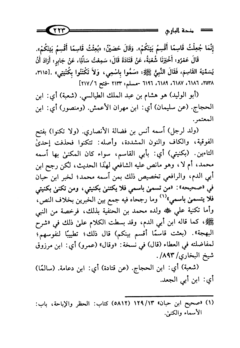 إِنَّمَا جُعِلْتُ قَاسِمًا أَقْسِمُ بَيْنَكُمْ"، وَقَال حُصَيْنٌ: "بُعِثْتُ قَاسِمًا أَقْسِمُ بَيْنَكُمْ"، قَال عَمْرٌو: أَخْبَرَنَا شُعْبَةُ، عَنْ قَتَادَةَ، قَال: سَمِعْتُ سَالِمًا، عَنْ جَابِرٍ، أَرَادَ أَنْ يُسَمِّيَهُ القَاسِمَ فَقَال النَّبِيُّ صَلَّى اللهُ عَلَيْهِ وَسَلَّمَ: "سَمُّوا بِاسْمِي وَلَا تَكْتَنُوا بِكُنْيَتِي".