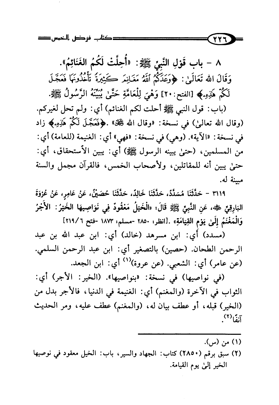3119 - حَدَّثَنَا مُسَدَّدٌ، حَدَّثَنَا خَالِدٌ، حَدَّثَنَا حُصَيْنٌ، عَنْ عَامِرٍ، عَنْ عُرْوَةَ البَارِقِيِّ رَضِيَ اللَّهُ عَنْهُ، عَنِ النَّبِيِّ صَلَّى اللهُ عَلَيْهِ وَسَلَّمَ، قَال: "الخَيْلُ مَعْقُودٌ فِي نَوَاصِيهَا الخَيْرُ الأَجْرُ، وَالمَغْنَمُ إِلَى يَوْمِ القِيَامَةِ".