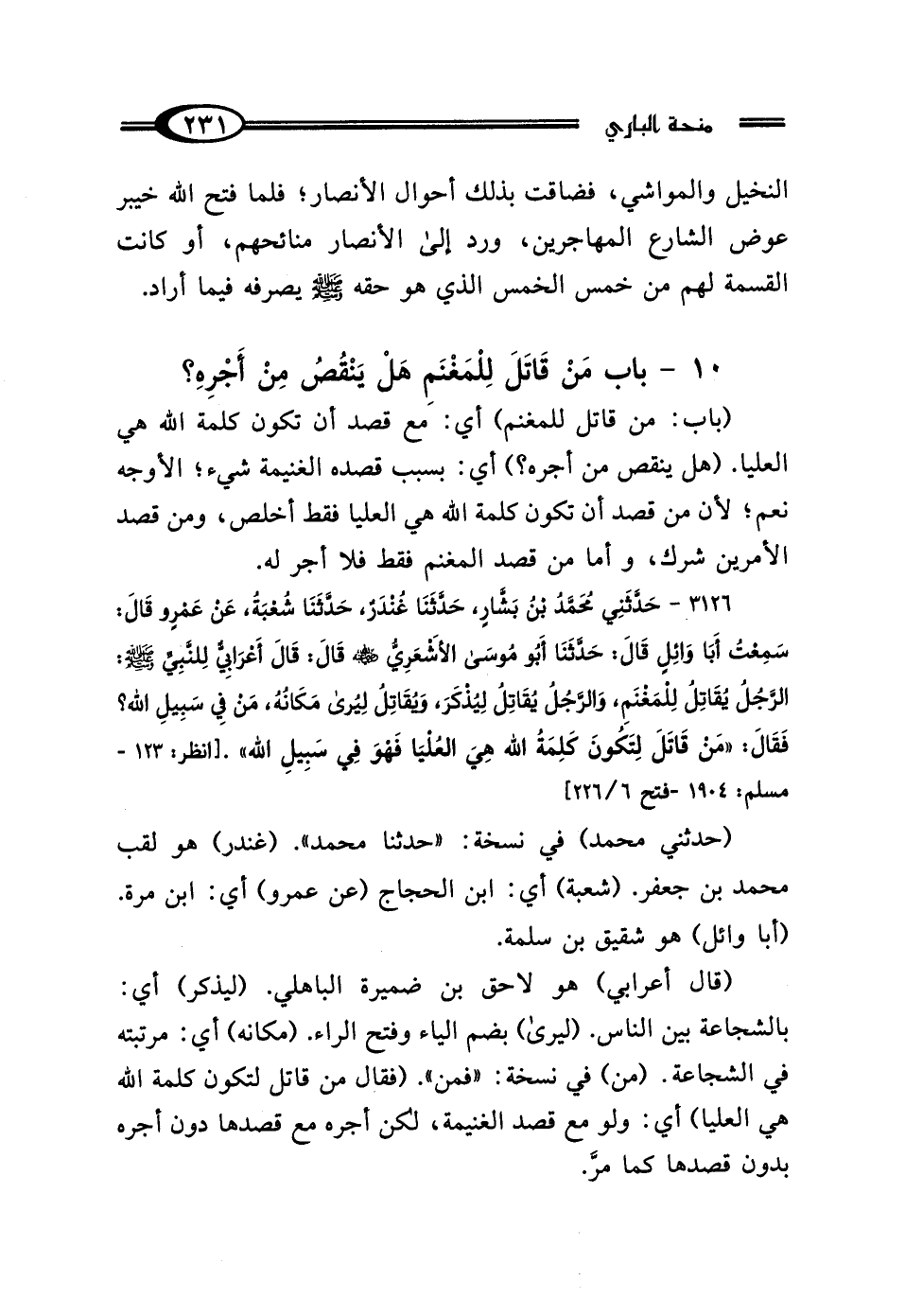 3126 - حَدَّثَنِي مُحَمَّدُ بْنُ بَشَّارٍ، حَدَّثَنَا غُنْدَرٌ، حَدَّثَنَا شُعْبَةُ، عَنْ عَمْرٍو، قَال: سَمِعْتُ أَبَا وَائِلٍ، قَال: حَدَّثَنَا أَبُو مُوسَى الأَشْعَرِيُّ رَضِيَ اللَّهُ عَنْهُ، قَال: قَال أَعْرَابِيٌّ لِلنَّبِيِّ صَلَّى اللهُ عَلَيْهِ وَسَلَّمَ: الرَّجُلُ يُقَاتِلُ لِلْمَغْنَمِ، وَالرَّجُلُ يُقَاتِلُ لِيُذْكَرَ، وَيُقَاتِلُ لِيُرَى مَكَانُهُ، مَنْ فِي سَبِيلِ اللَّهِ؟ فَقَال: "مَنْ قَاتَلَ، لِتَكُونَ كَلِمَةُ اللَّهِ هِيَ العُلْيَا، فَهُوَ فِي سَبِيلِ اللَّهِ".