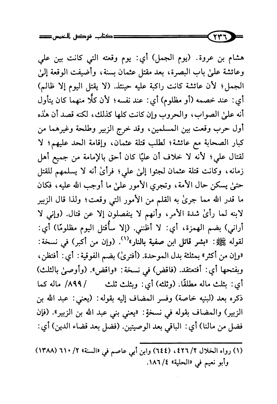 هشام بن عروة. (يوم الجمل) أي: يوم وقعته التي كانت بين علي وعائشة على باب البصرة، بعد مقتل عثمان بسنة، وأضيفت الوقعة إلى الجمل؛ لأن عائشة كانت راكبة عليه حينئذ. (لا يقتل اليوم إلا ظالم) أي: عند خصمه (أو مظلوم) أي: عند نفسه؛ لأن كلًّا منهما كان يتأول أنه على الصواب، والحروب وإن كانت كلها كذلك، لكنه قصد أن هذه أول حرب وقعت بين المسلمين، وقد خرج الزبير وطلحة وغيرهما من كبار الصحابة مع عائشة؛ لطلب قتلة عثمان، وإقامة الحد عليهم؛ لا لقتال علي؛ لأنه لا خلاف أن عليًّا كان أحق بالإمامة من جميع أهل زمانه، وكانت قتلة عثمان لجئوا إلا علي؛ فرأى أنه لا يسلمهم للقتل حتى يسكن حال الأمة، وتجري الأمور على ما أوجب الله عليه، فكان ما قدر الله مما جرى به القلم من الأمور التي وقعت؛ ولذا قال الزبير لابنه لما رأى شدة الأمر، وأنهم لا ينفصلون إلا عن قتال. (وإني لا أراني) بضم الهمزة، أي: لا أظنني. (إلا سأقتل اليوم مظلومًا) أي: لقوله - صلى الله عليه وسلم -: "بشر قاتل ابن صفية بالنار" (¬1). (وإن من أكبر) في نسخة: "وإن من أكثر" بمثلثة بدل الموحدة. (أفترى) بضم الفوقية: أي: أفتظن، وبفتحها أي: أفتعتقد. (فاقض) في نسخة: "واقض". (وأوصى بالثلث) أي: بثلث ماله مطلقًا. (وثلثه) أي: وبثلث ثلث ماله كما ذكره بعد (لبنيه خاصة) وفسر المضاف إليه بقوله: (يعني: عبد الله بن الزبير) والمضاف بقوله في نسخةٍ: "يعني بني عبد الله بن الزبير". (فإن فضل من مالنا) أي: الباقي بعد الوصيتين. (فضل بعد قضاء الدين) أي:
