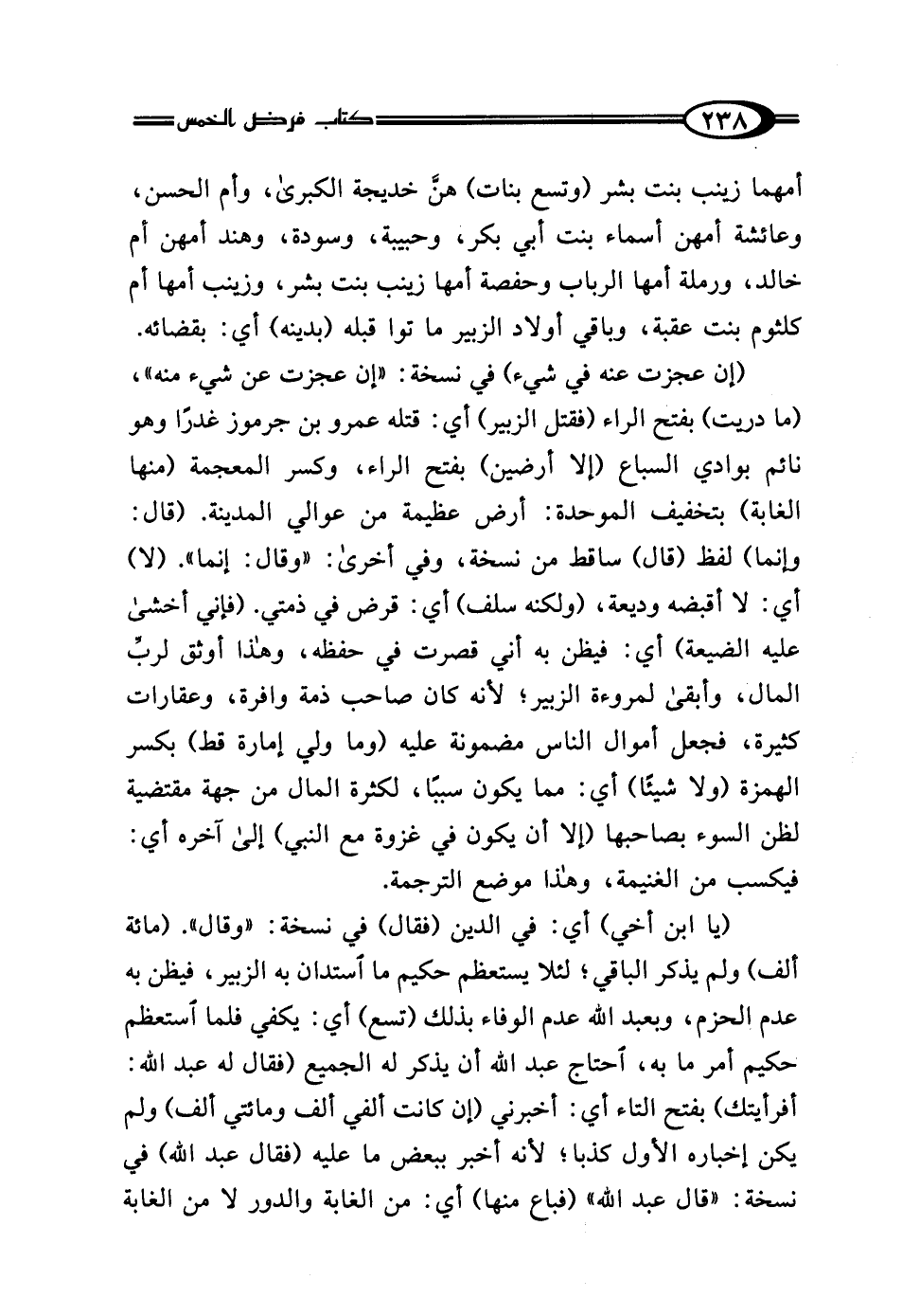 (إن عجزت عنه في شيء) في نسخة: "إن عجزت عن شيء منه"، (ما دريت) بفتح الراء (فقتل الزبير) أي: قتله عمرو بن جرموز غدرًا وهو نائم بوادي السباع (إلا أرضين) بفتح الراء، وكسر المعجمة (منها الغابة) بتخفيف الموحدة: أرض عظيمة من عوالي المدينة. (قال: وإنما) لفظ (قال) ساقط من نسخة، وفي أخرى: "وقال: إنما". (لا) أي: لا أقبضه وديعة، (ولكنه سلف) أي: قرض في ذمتي. (فإني أخشى عليه الضيعة) أي: فيظن به أني قصرت في حفظه، وهذا أوثق لربِّ المال، وأبقى لمروءة الزبير؛ لأنه كان صاحب ذمة وافرة، وعقارات كثيرة، فجعل أموال الناس مضمونة عليه (وما ولي إمارة قط) بكسر الهمزة (ولا شيئًا) أي: مما يكون سببًا، لكثرة المال من جهة مقتضية لظن السوء بصاحبها (إلا أن يكون في غزوة مع النبي) إلى آخره أي: فيكسب من الغنيمة، وهذا موضع الترجمة.