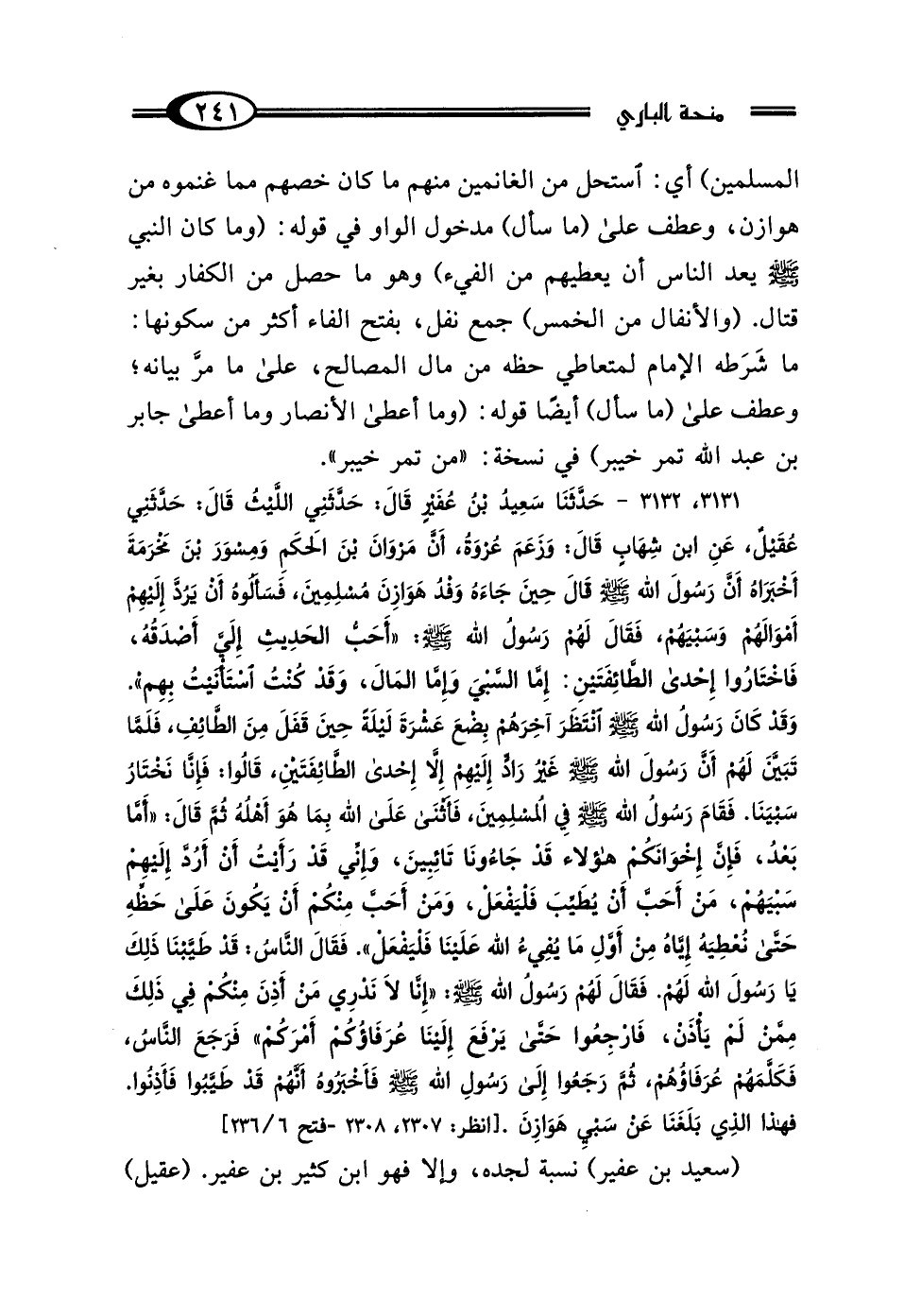 3131، 3132 - حَدَّثَنَا سَعِيدُ بْنُ عُفَيْرٍ، قَال: حَدَّثَنِي اللَّيْثُ، قَال: حَدَّثَنِي عُقَيْلٌ، عَنِ ابْنِ شِهَابٍ، قَال: وَزَعَمَ عُرْوَةُ أَنَّ مَرْوَانَ بْنَ الحَكَمِ، وَمِسْوَرَ بْنَ مَخْرَمَةَ، أَخْبَرَاهُ أَنَّ رَسُولَ اللَّهِ صَلَّى اللهُ عَلَيْهِ وَسَلَّمَ، قَال حِينَ جَاءَهُ وَفْدُ هَوَازِنَ مُسْلِمِينَ: فَسَأَلُوهُ أَنْ يَرُدَّ إِلَيْهِمْ أَمْوَالهُمْ وَسَبْيَهُمْ، فَقَال لَهُمْ رَسُولُ اللَّهِ صَلَّى اللهُ عَلَيْهِ وَسَلَّمَ: "أَحَبُّ الحَدِيثِ إِلَيَّ أَصْدَقُهُ، فَاخْتَارُوا إِحْدَى الطَّائِفَتَيْنِ، إِمَّا السَّبْيَ وَإِمَّا المَال، وَقَدْ كُنْتُ اسْتَأْنَيْتُ بِهِمْ"، وَقَدْ كَانَ رَسُولُ اللَّهِ صَلَّى اللهُ عَلَيْهِ وَسَلَّمَ انْتَظَرَ آخِرَهُمْ بِضْعَ عَشْرَةَ لَيْلَةً حِينَ قَفَلَ مِنَ الطَّائِفِ، فَلَمَّا تَبَيَّنَ لَهُمْ أَنَّ رَسُولَ اللَّهِ صَلَّى اللهُ عَلَيْهِ وَسَلَّمَ غَيْرُ رَادٍّ إِلَيْهِمْ إلا إِحْدَى الطَّائِفَتَيْنِ قَالُوا: فَإِنَّا نَخْتَارُ سَبْيَنَا، فَقَامَ رَسُولُ اللَّهِ صَلَّى اللهُ عَلَيْهِ وَسَلَّمَ فِي المُسْلِمِينَ، فَأَثْنَى عَلَى اللَّهِ بِمَا هُوَ أَهْلُهُ، ثُمَّ قَال: "أَمَّا بَعْدُ، فَإِنَّ إِخْوَانَكُمْ هَؤُلاءِ قَدْ جَاءُونَا تَائِبِينَ، وَإِنِّي قَدْ رَأَيْتُ أَنْ أَرُدَّ إِلَيْهِمْ سَبْيَهُمْ مَنْ أَحَبَّ أَنْ يُطَيِّبَ، فَلْيَفْعَلْ وَمَنْ أَحَبَّ مِنْكُمْ أَنْ يَكُونَ عَلَى حَظِّهِ حَتَّى نُعْطِيَهُ إِيَّاهُ مِنْ أَوَّلِ مَا يُفِيءُ اللَّهُ عَلَيْنَا فَلْيَفْعَلْ؟ "، فَقَال النَّاسُ: قَدْ طَيَّبْنَا ذَلِكَ يَا رَسُولَ اللَّهِ لَهُمْ، فَقَال لَهُمْ رَسُولُ اللَّهِ صَلَّى اللهُ عَلَيْهِ وَسَلَّمَ: "إِنَّا لَا نَدْرِي مَنْ أَذِنَ مِنْكُمْ فِي ذَلِكَ مِمَّنْ لَمْ يَأْذَنْ، فَارْجِعُوا حَتَّى يَرْفَعَ إِلَيْنَا عُرَفَاؤُكُمْ أَمْرَكُمْ"، فَرَجَعَ النَّاسُ فَكَلَّمَهُمْ عُرَفَاؤُهُمْ، ثُمَّ رَجَعُوا إِلَى رَسُولِ اللَّهِ صَلَّى اللهُ عَلَيْهِ وَسَلَّمَ، فَأَخْبَرُوهُ أَنَّهُمْ قَدْ طَيَّبُوا وَأَذِنُوا، فَهَذَا الَّذِي بَلَغَنَا عَنْ سَبْيِ هَوَازِنَ.