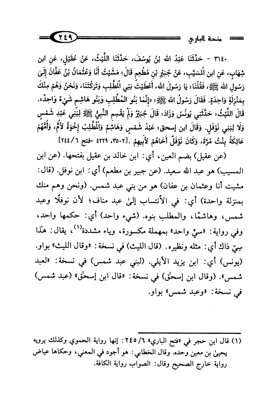 3140 - حَدَّثَنَا عَبْدُ اللَّهِ بْنُ يُوسُفَ، حَدَّثَنَا اللَّيْثُ، عَنْ عُقَيْلٍ، عَنِ ابْنِ شِهَابٍ، عَنِ ابْنِ المُسَيِّبِ، عَنْ جُبَيْرِ بْنِ مُطْعِمٍ قَال: مَشَيْتُ أَنَا وَعُثْمَانُ بْنُ عَفَّانَ إِلَى رَسُولِ اللَّهِ صَلَّى اللهُ عَلَيْهِ وَسَلَّمَ، فَقُلْنَا: يَا رَسُولَ اللَّهِ أَعْطَيْتَ بَنِي المُطَّلِبِ وَتَرَكْتَنَا، وَنَحْنُ وَهُمْ مِنْكَ بِمَنْزِلَةٍ وَاحِدَةٍ؟ فَقَال رَسُولُ اللَّهِ صَلَّى اللهُ عَلَيْهِ وَسَلَّمَ: "إِنَّمَا بَنُو المُطَّلِبِ، وَبَنُو هَاشِمٍ شَيْءٌ وَاحِدٌ" قَال اللَّيْثُ: حَدَّثَنِي يُونُسُ، وَزَادَ، قَال جُبَيْرٌ: وَلَمْ يَقْسِمُ النَّبِيُّ صَلَّى اللهُ عَلَيْهِ وَسَلَّمَ لِبَنِي عَبْدِ شَمْسٍ، وَلَا لِبَنِي نَوْفَلٍ، وَقَال ابْنُ إِسْحَاقَ: عَبْدُ شَمْسٍ، وَهَاشِمٌ، وَالمُطَّلِبُ إِخْوَةٌ لِأُمٍّ، وَأُمُّهُمْ عَاتِكَةُ بِنْتُ مُرَّةَ، وَكَانَ نَوْفَلٌ أَخَاهُمْ لِأَبِيهِمْ.