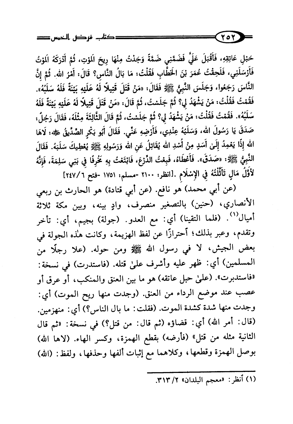 حَبْلِ عَاتِقِهِ، فَأَقْبَلَ عَلَيَّ فَضَمَّنِي ضَمَّةً وَجَدْتُ مِنْهَا رِيحَ المَوْتِ، ثُمَّ أَدْرَكَهُ المَوْتُ، فَأَرْسَلَنِي، فَلَحِقْتُ عُمَرَ بْنَ الخَطَّابِ فَقُلْتُ: مَا بَالُ النَّاسِ؟ قَال: أَمْرُ اللَّهِ، ثُمَّ إِنَّ النَّاسَ رَجَعُوا، وَجَلَسَ النَّبِيُّ صَلَّى اللهُ عَلَيْهِ وَسَلَّمَ فَقَال: "مَنْ قَتَلَ قَتِيلًا لَهُ عَلَيْهِ بَيِّنَةٌ فَلَهُ سَلَبُهُ"، فَقُمْتُ فَقُلْتُ: مَنْ يَشْهَدُ لِي، ثُمَّ جَلَسْتُ، ثُمَّ قَال: "مَنْ قَتَلَ قَتِيلًا لَهُ عَلَيْهِ بَيِّنَةٌ فَلَهُ سَلَبُهُ"، فَقُمْتُ فَقُلْتُ: مَنْ يَشْهَدُ لِي، ثُمَّ جَلَسْتُ، ثُمَّ قَال الثَّالِثَةَ مِثْلَهُ، فَقُمْتُ، فَقَال رَسُولُ اللَّهِ صَلَّى اللهُ عَلَيْهِ وَسَلَّمَ: "مَا لَكَ يَا أَبَا قَتَادَةَ؟ "، فَاقْتَصَصْتُ عَلَيْهِ القِصَّةَ، فَقَال رَجُلٌ: صَدَقَ يَا رَسُولَ اللَّهِ، وَسَلَبُهُ عِنْدِي فَأَرْضِهِ عَنِّي، فَقَال أَبُو بَكْرٍ الصِّدِّيقُ رَضِيَ اللَّهُ عَنْهُ: لاهَا اللَّهِ، إِذًا لَا يَعْمِدُ إِلَى أَسَدٍ مِنْ أُسْدِ اللَّهِ، يُقَاتِلُ عَنِ اللَّهِ وَرَسُولِهِ صَلَّى اللهُ عَلَيْهِ وَسَلَّمَ، يُعْطِيكَ سَلَبَهُ، فَقَال النَّبِيُّ صَلَّى اللهُ عَلَيْهِ وَسَلَّمَ: "صَدَقَ"، فَأَعْطَاهُ، فَبِعْتُ الدِّرْعَ، فَابْتَعْتُ بِهِ مَخْرَفًا فِي بَنِي سَلِمَةَ، فَإِنَّهُ لَأَوَّلُ مَالٍ تَأَثَّلْتُهُ فِي الإِسْلامِ.