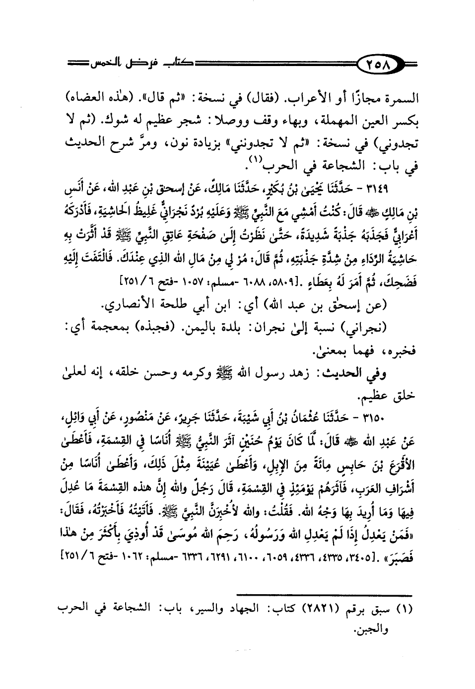 3149 - حَدَّثَنَا يَحْيَى بْنُ بُكَيْرٍ، حَدَّثَنَا مَالِكٌ، عَنْ إِسْحَاقَ بْنِ عَبْدِ اللَّهِ، عَنْ أَنَسِ بْنِ مَالِكٍ رَضِيَ اللَّهُ عَنْهُ، قَال: كُنْتُ أَمْشِي مَعَ النَّبِيِّ صَلَّى اللهُ عَلَيْهِ وَسَلَّمَ وَعَلَيْهِ بُرْدٌ نَجْرَانِيٌّ غَلِيظُ الحَاشِيَةِ، فَأَدْرَكَهُ أَعْرَابِيٌّ فَجَذَبَهُ جَذْبَةً شَدِيدَةً، حَتَّى نَظَرْتُ إِلَى صَفْحَةِ عَاتِقِ النَّبِيِّ صَلَّى اللهُ عَلَيْهِ وَسَلَّمَ قَدْ أَثَّرَتْ بِهِ حَاشِيَةُ الرِّدَاءِ مِنْ شِدَّةِ جَذْبَتِهِ، ثُمَّ قَال: مُرْ لِي مِنْ مَالِ اللَّهِ الَّذِي عِنْدَكَ، فَالْتَفَتَ إِلَيْهِ فَضَحِكَ، ثُمَّ "أَمَرَ لَهُ بِعَطَاءٍ".