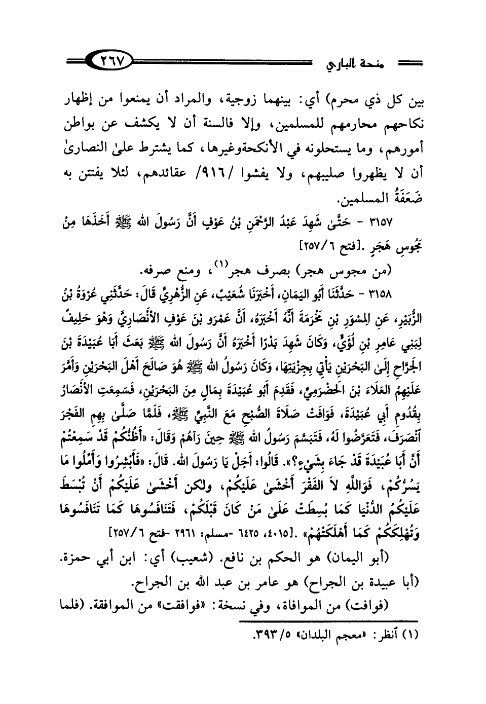 3157 - حَتَّى شَهِدَ عَبْدُ الرَّحْمَنِ بْنُ عَوْفٍ أَنَّ رَسُولَ اللَّهِ صَلَّى اللهُ عَلَيْهِ وَسَلَّمَ أَخَذَهَا مِنْ مَجُوسِ هَجَرَ".