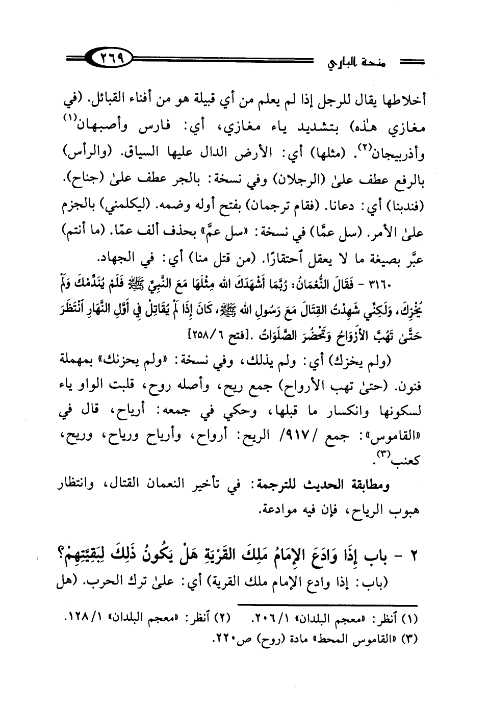 أخلاطها يقال للرجل إذا لم يعلم من أي قبيلة هو من أفناء القبائل. (في مغازي هذه) بتشديد ياء مغازي، أي: فارس وأصبهان (¬1) وأذربيجان (¬2). (مثلها) أي: الأرض الدال عليها السياق. (والرأس) بالرفع عطف على (الرجلان) وفي نسخة: بالجر عطف على (جناح). (فندبنا) أي: دعانا. (فقام ترجمان) بفتح أوله وضمه. (ليكلمني) بالجزم على الأمر. (سل عمَّا) في نسخة: "سل عمَّ" بحذف ألف عمّا. (ما أنتم) عبَّر بصيغة ما لا يعقل احتقارًا. (من قتل منا) أي: في الجهاد.