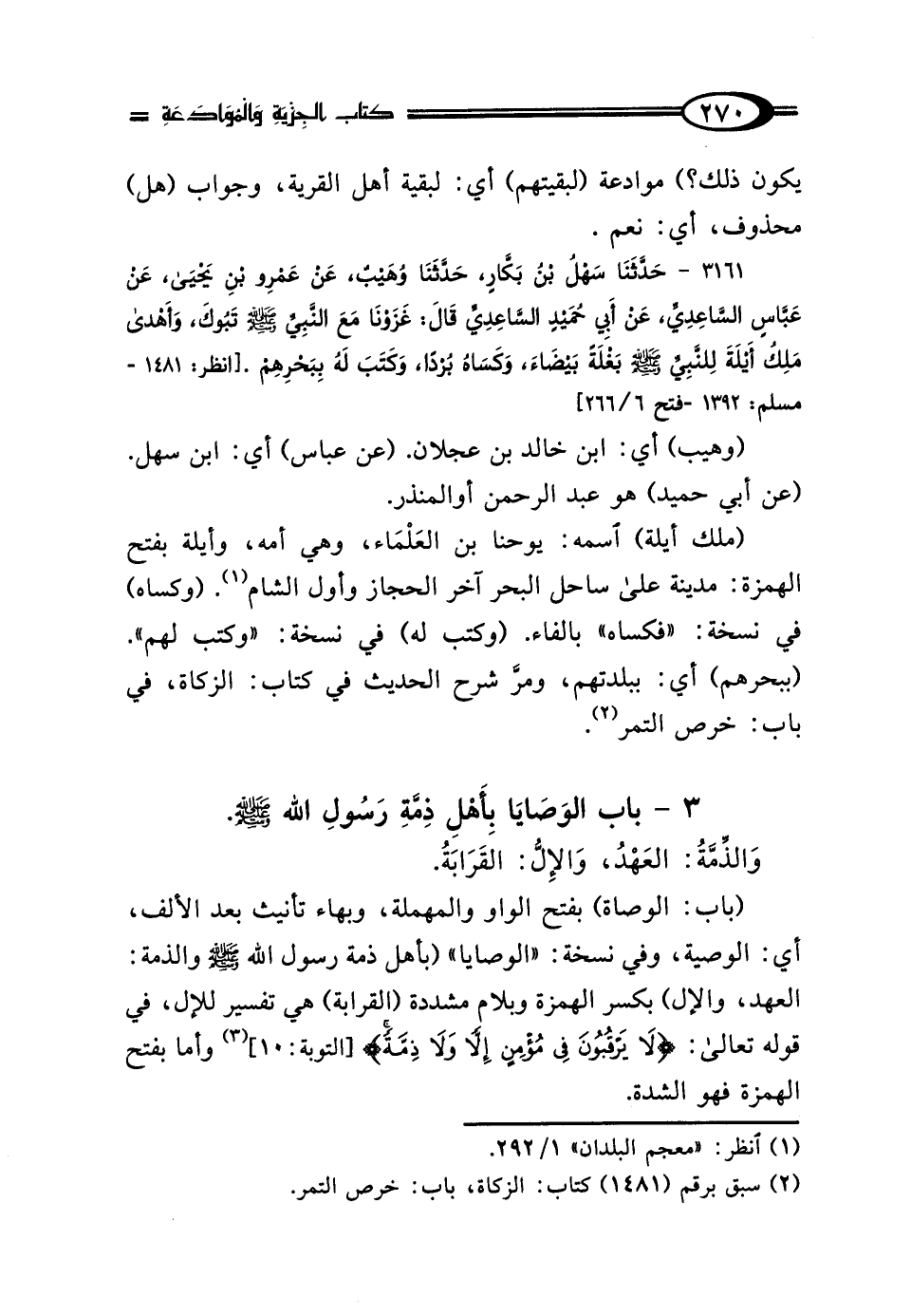 3161 - حَدَّثَنَا سَهْلُ بْنُ بَكَّارٍ، حَدَّثَنَا وُهَيْبٌ، عَنْ عَمْرِو بْنِ يَحْيَى، عَنْ عَبَّاسٍ السَّاعِدِيِّ، عَنْ أَبِي حُمَيْدٍ السَّاعِدِيِّ، قَال: "غَزَوْنَا مَعَ النَّبِيِّ صَلَّى اللهُ عَلَيْهِ وَسَلَّمَ تَبُوكَ وَأَهْدَى مَلِكُ أَيْلَةَ لِلنَّبِيِّ صَلَّى اللهُ عَلَيْهِ وَسَلَّمَ بَغْلَةً بَيْضَاءَ، وَكَسَاهُ بُرْدًا، وَكَتَبَ لَهُ بِبَحْرِهِمْ".