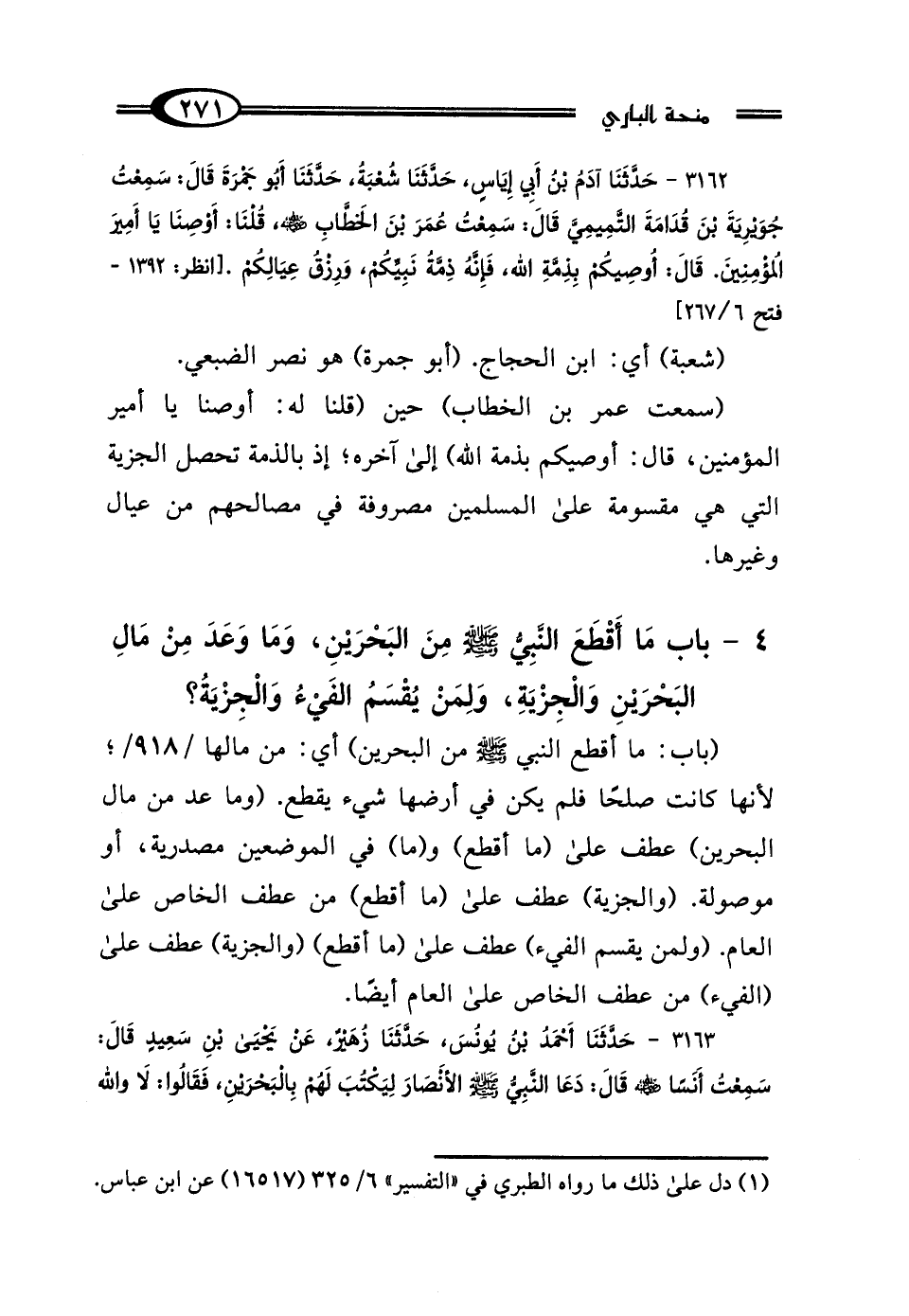 3162 - حَدَّثَنَا آدَمُ بْنُ أَبِي إِيَاسٍ، حَدَّثَنَا شُعْبَةُ، حَدَّثَنَا أَبُو جَمْرَةَ، قَال: سَمِعْتُ جُوَيْرِيَةَ بْنَ قُدَامَةَ التَّمِيمِيَّ، قَال: سَمِعْتُ عُمَرَ بْنَ الخَطَّابِ رَضِيَ اللَّهُ عَنْهُ، قُلْنَا: أَوْصِنَا يَا أَمِيرَ المُؤْمِنِينَ، قَال: "أُوصِيكُمْ بِذِمَّةِ اللَّهِ، فَإِنَّهُ ذِمَّةُ نَبِيِّكُمْ، وَرِزْقُ عِيَالِكُمْ".