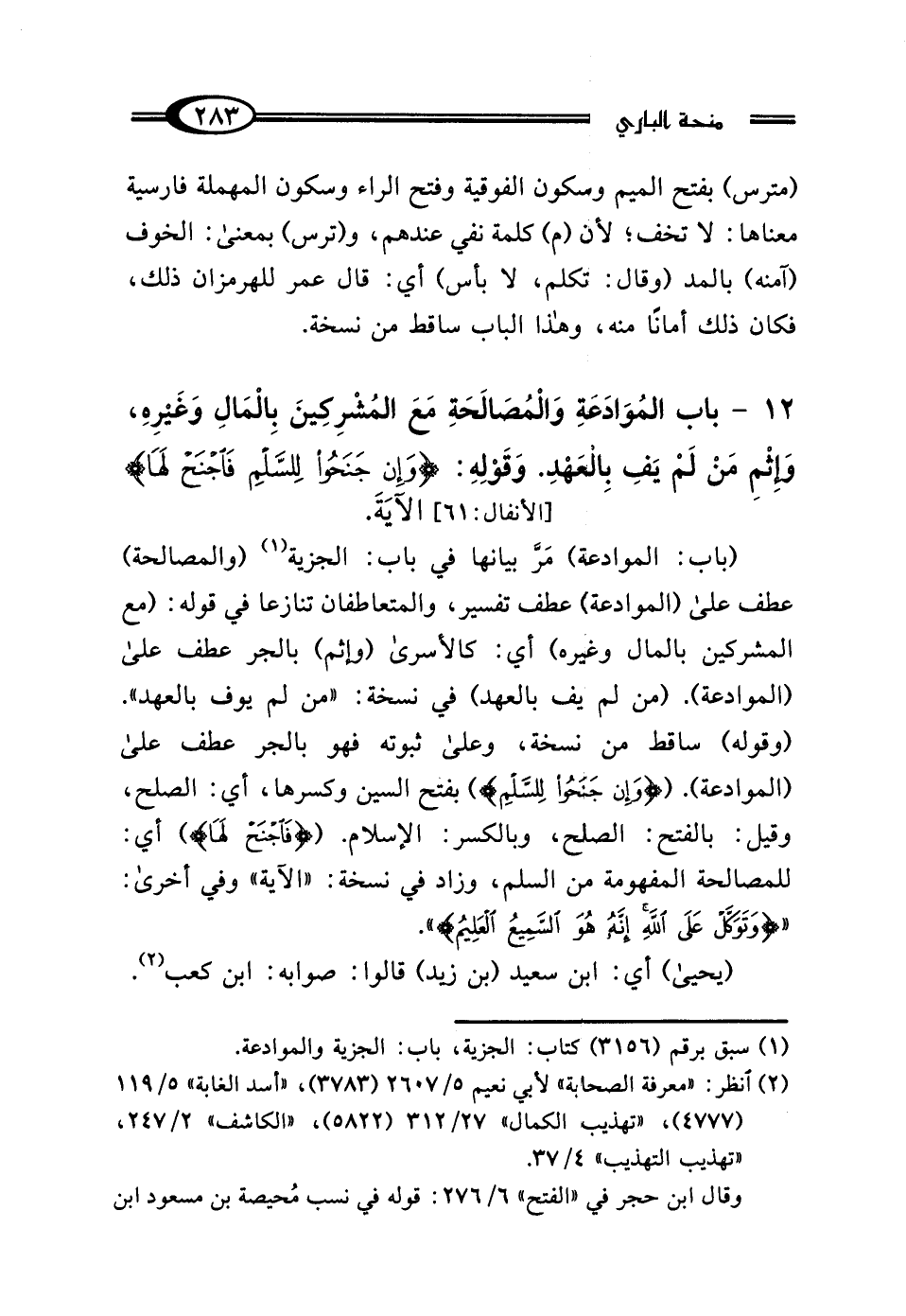 (باب: الموادعة) مَرَّ بيانها في باب: الجزية (¬1) (والمصالحة) عطف على (الموادعة) عطف تفسير، والمتعاطفان تنازعا في قوله: (مع المشركين بالمال وغيره) أي: كالأسرى (وإثم) بالجر عطف على (الموادعة). (من لم يف بالعهد) في نسخة: "من لم يوف بالعهد". (وقوله) ساقط من نسخة، وعلى ثبوته فهو بالجر عطف على (الموادعة). ({وَإِنْ جَنَحُوا لِلسَّلْمِ}) بفتح السين وكسرها، أي: الصلح، وقيل: بالفتح: الصلح، وبالكسر: الإسلام. ({فَاجْنَحْ لَهَا}) أي: للمصالحة المفهومة من السلم، وزاد في نسخة: "الآية" وفي أخرى: " {وَتَوَكَّلْ عَلَى اللَّهِ إِنَّهُ هُوَ السَّمِيعُ الْعَلِيمُ} ".