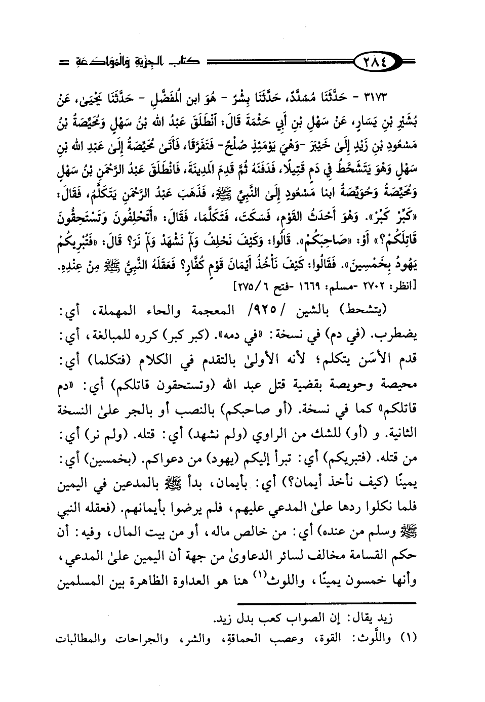 (يتشحط) بالشين المعجمة والحاء المهملة، أي: يضطرب. (في دم) في نسخة: "في دمه". (كبر كبر) كرره للمبالغة، أي: قدم الأسَن يتكلم؛ لأنه الأولى بالتقدم في الكلام (فتكلما) أي: محيصة وحويصة بقضية قتل عبد الله (وتستحقون قاتلكم) أي: "دم قاتلكم" كما في نسخة. (أو صاحبكم) بالنصب أو بالجر على النسخة الثانية. و (أو) للشك من الراوي (ولم نشهد) أي: قتله. (ولم نر) أي: من قتله. (فتبريكم) أي: تبرأ إليكم (يهود) من دعواكم. (بخمسين) أي: يمينًا (كيف نأخذ أيمان؟) أي: بأيمان، بدأ - صلى الله عليه وسلم - بالمدعين في اليمين فلما نكلوا ردها على المدير عليهم، فلم يرضوا بأيمانهم. (فعقله النبي - صلى الله عليه وسلم - وسلم من عنده) أي: من خالص ماله، أو من بيت المال، وفيه: أن حكم القسامة مخالف لسائر الدعاوى من جهة أن اليمين على المدعي، وأنها خمسون يمينًا، واللوث (¬1) هنا هو العداوة الظاهرة بين المسلمين