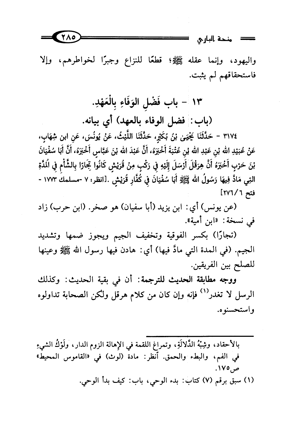 3174 - حَدَّثَنَا يَحْيَى بْنُ بُكَيْرٍ، حَدَّثَنَا اللَّيْثُ، عَنْ يُونُسَ، عَنِ ابْنِ شِهَابٍ، عَنْ عُبَيْدِ اللَّهِ بْنِ عَبْدِ اللَّهِ بْنِ عُتْبَةَ، أَخْبَرَهُ: أَنَّ عَبْدَ اللَّهِ بْنَ عَبَّاسٍ، أَخْبَرَهُ أَنَّ أَبَا سُفْيَانَ بْنَ حَرْبِ بْنِ أُمَيَّةَ أَخْبَرَهُ: "أَنَّ هِرَقْلَ أَرْسَلَ إِلَيْهِ فِي رَكْبٍ مِنْ قُرَيْشٍ كَانُوا تِجَارًا بِالشَّأْمِ، فِي المُدَّةِ الَّتِي مَادَّ فِيهَا رَسُولُ اللَّهِ صَلَّى اللهُ عَلَيْهِ وَسَلَّمَ أَبَا سُفْيَانَ فِي كُفَّارِ قُرَيْشٍ".
