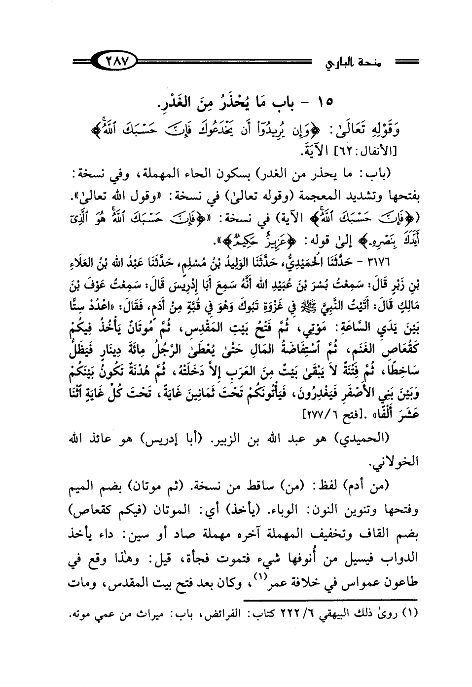 (باب: ما يحذر من الغدر) بسكون الحاء المهملة، وفي نسخة: بفتحها وتشديد المعجمة (وقوله تعالى) في نسخة: "وقول الله تعالى". ({فَإِنَّ حَسْبَكَ اللَّهُ} الآية) في نسخة: " {فَإِنَّ حَسْبَكَ اللَّهُ هُوَ الَّذِي أَيَّدَكَ بِنَصْرِهِ} إلى قوله: {عَزِيزٌ حَكِيمٌ} ".