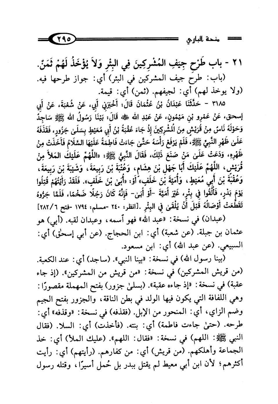 3185 - حَدَّثَنَا عَبْدَانُ بْنُ عُثْمَانَ، قَال: أَخْبَرَنِي أَبِي، عَنْ شُعْبَةَ، عَنْ أَبِي إِسْحَاقَ، عَنْ عَمْرِو بْنِ مَيْمُونٍ، عَنْ عَبْدِ اللَّهِ رَضِيَ اللَّهُ عَنْهُ، قَال: بَيْنَا رَسُولُ اللَّهِ صَلَّى اللهُ عَلَيْهِ وَسَلَّمَ سَاجِدٌ وَحَوْلَهُ نَاسٌ مِنْ قُرَيْشٍ مِنَ المُشْرِكِينَ، إِذْ جَاءَ عُقْبَةُ بْنُ أَبِي مُعَيْطٍ بِسَلَى جَزُورٍ، فَقَذَفَهُ عَلَى ظَهْرِ النَّبِيِّ صَلَّى اللهُ عَلَيْهِ وَسَلَّمَ، فَلَمْ يَرْفَعْ رَأْسَهُ حَتَّى جَاءَتْ فَاطِمَةُ عَلَيْهَا السَّلامُ، فَأَخَذَتْ مِنْ ظَهْرِهِ، وَدَعَتْ عَلَى مَنْ صَنَعَ ذَلِكَ، فَقَال النَّبِيُّ صَلَّى اللهُ عَلَيْهِ وَسَلَّمَ: "اللَّهُمَّ عَلَيْكَ المَلا مِنْ قُرَيْشٍ، اللَّهُمَّ عَلَيْكَ أَبَا جَهْلِ بْنَ هِشَامٍ، وَعُتْبَةَ بْنَ رَبِيعَةَ، وَشَيْبَةَ بْنَ رَبِيعَةَ، وَعُقْبَةَ بْنَ أَبِي مُعَيْطٍ، وَأُمَيَّةَ بْنَ خَلَفٍ، أَوْ أُبَيَّ بْنَ خَلَفٍ"، فَلَقَدْ رَأَيْتُهُمْ قُتِلُوا يَوْمَ بَدْرٍ، فَأُلْقُوا فِي بِئْرٍ غَيْرَ أُمَيَّةَ، أَوْ أُبَيٍّ، فَإِنَّهُ كَانَ رَجُلًا ضَخْمًا، فَلَمَّا جَرُّوهُ تَقَطَّعَتْ أَوْصَالُهُ قَبْلَ أَنْ يُلْقَى فِي البِئْرِ.
