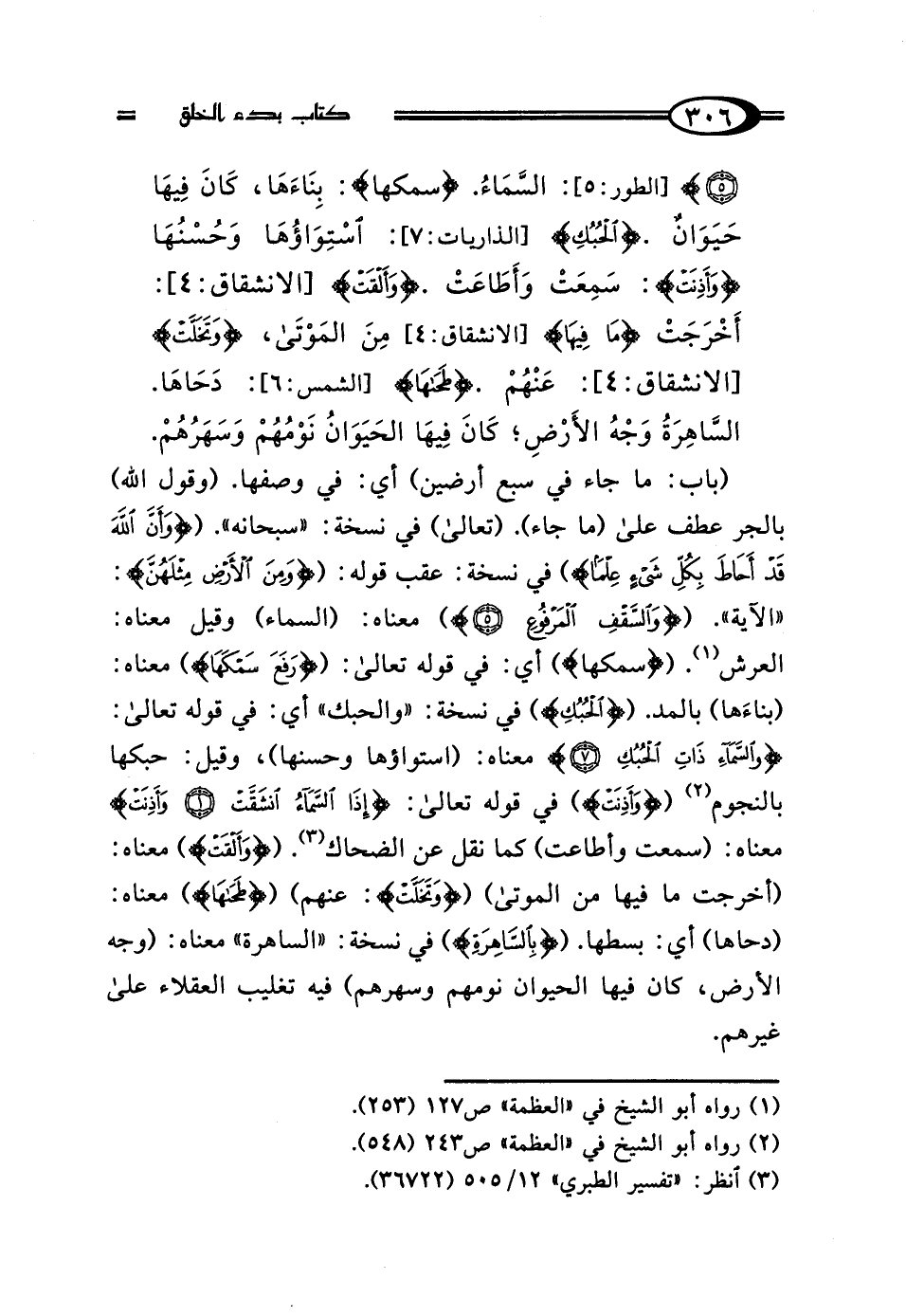(باب: ما جاء في سبع أرضين) أي: في وصفها. (وقول الله) بالجر عطف على (ما جاء). (تعالى) في نسخة: "سبحانه". ({وَأَنَّ اللَّهَ قَدْ أَحَاطَ بِكُلِّ شَيْءٍ عِلْمًا}) في نسخة: عقب قوله: ({وَمِنَ الْأَرْضِ مِثْلَهُنَّ}: "الآية". ({وَالسَّقْفِ الْمَرْفُوعِ (5)}) معناه: (السماء) وقيل معناه: العرش (¬1). ({سَمْكَهَا}) أي: في قوله تعالى: ({رَفَعَ سَمْكَهَا}) معناه: (بناءَها) بالمد. ({الْحُبُكِ}) في نسخة: "والحبك" أي: في قوله تعالى: {وَالسَّمَاءِ ذَاتِ الْحُبُكِ (7)} معناه: (استواؤها وحسنها)، وقيل: حبكها بالنجوم (¬2) ({وَأَذِنَتْ}) في قوله تعالى: {إِذَا السَّمَاءُ انْشَقَّتْ (1) وَأَذِنَتْ} معناه: (سمعت وأطاعت) كما نقل عن الضحاك (¬3). ({وَأَلْقَتْ}) معناه: (أخرجت ما فيها من الموتى) ({وَتَخَلَّتْ}: عنهم) ({طَحَاهَا}) معناه: (دحاها) أي: بسطها. ({بِالسَّاهِرَةِ}) في نسخة: "الساهرة" معناه: (وجه الأرض، كان فيها الحيوان نومهم وسهرهم) فيه تغليب العقلاء على غيرهم.