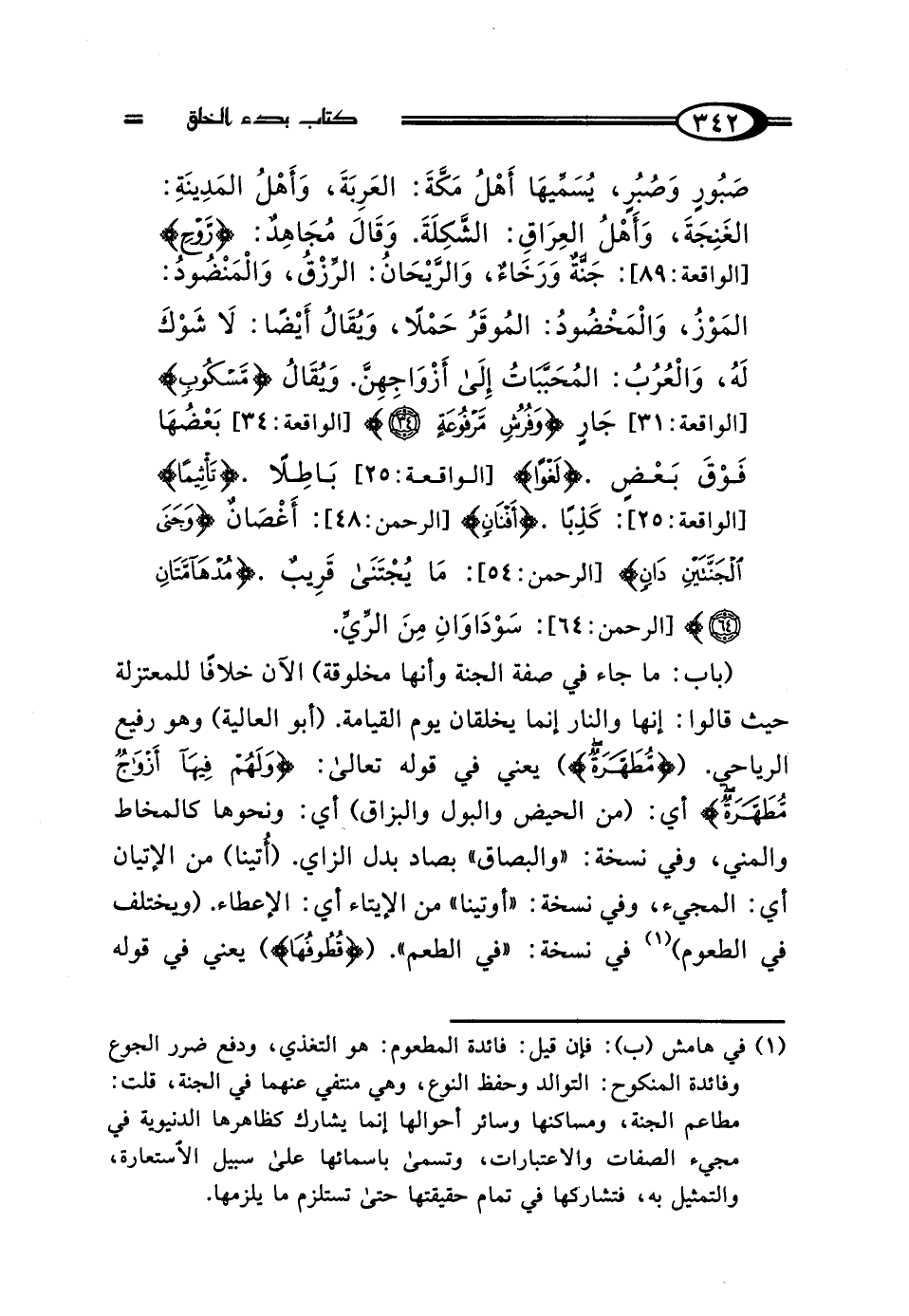 (باب: ما جاء في صفة الجنة وأنها مخلوقة) الآن خلافًا للمعتزلة حيث قالوا: إنها والنار إنما يخلقان يوم القيامة. (أبو العالية) وهو رفيع الرياحى. ({مُطَهَّرَةٌ}) يعني في قوله تعالى: {وَلَهُمْ فِيهَا أَزْوَاجٌ مُطَهَّرَةٌ} أي: (من الحيض والبول والبزاق) أي: ونحوها كالمخاط والمني، وفي نسخة: "والبصاق" بصاد بدل الزاي. (أُتينا) من الإتيان أي: المجيء، وفي نسخة: "أوتينا" من الإيتاء أي: الإعطاء. (ويختلف في الطعوم) (¬1) في نسخة: "في الطعم". ({قُطُوفُهَا}) يعني في قوله