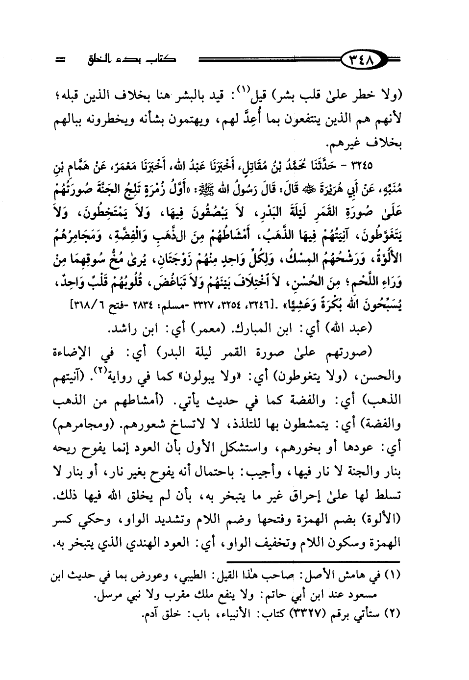 3245 - حَدَّثَنَا مُحَمَّدُ بْنُ مُقَاتِلٍ، أَخْبَرَنَا عَبْدُ اللَّهِ، أَخْبَرَنَا مَعْمَرٌ، عَنْ هَمَّامِ بْنِ مُنَبِّهٍ، عَنْ أَبِي هُرَيْرَةَ رَضِيَ اللَّهُ عَنْهُ، قَالَ: قَالَ رَسُولُ اللَّهِ صَلَّى اللهُ عَلَيْهِ وَسَلَّمَ: «أَوَّلُ زُمْرَةٍ تَلِجُ الجَنَّةَ صُورَتُهُمْ عَلَى صُورَةِ القَمَرِ لَيْلَةَ البَدْرِ، لاَ يَبْصُقُونَ فِيهَا، وَلاَ يَمْتَخِطُونَ، وَلاَ يَتَغَوَّطُونَ، آنِيَتُهُمْ فِيهَا الذَّهَبُ، أَمْشَاطُهُمْ مِنَ الذَّهَبِ وَالفِضَّةِ، وَمَجَامِرُهُمُ الأَلُوَّةُ، وَرَشْحُهُمُ المِسْكُ، وَلِكُلِّ وَاحِدٍ مِنْهُمْ زَوْجَتَانِ، يُرَى مُخُّ سُوقِهِمَا مِنْ وَرَاءِ اللَّحْمِ مِنَ الحُسْنِ، لاَ اخْتِلاَفَ بَيْنَهُمْ وَلاَ تَبَاغُضَ، قُلُوبُهُمْ قَلْبٌ وَاحِدٌ، يُسَبِّحُونَ اللَّهَ بُكْرَةً وَعَشِيًّا».