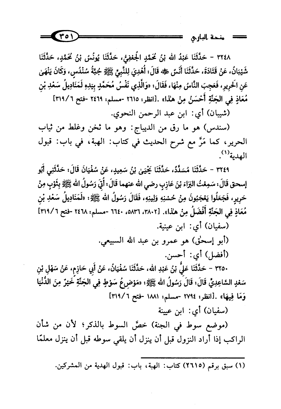 3249 - حَدَّثَنَا مُسَدَّدٌ، حَدَّثَنَا يَحْيَى بْنُ سَعِيدٍ، عَنْ سُفْيَانَ، قَال: حَدَّثَنِي أَبُو إِسْحَاقَ، قَال: سَمِعْتُ البَرَاءَ بْنَ عَازِبٍ رَضِيَ اللَّهُ عَنْهُمَا، قَال: أُتِيَ رَسُولُ اللَّهِ صَلَّى اللهُ عَلَيْهِ وَسَلَّمَ، بِثَوْبٍ مِنْ حَرِيرٍ فَجَعَلُوا يَعْجَبُونَ مِنْ حُسْنِهِ وَلِينِهِ، فَقَال رَسُولُ اللَّهِ صَلَّى اللهُ عَلَيْهِ وَسَلَّمَ: "لَمَنَادِيلُ سَعْدِ بْنِ مُعَاذٍ فِي الجَنَّةِ أَفْضَلُ مِنْ هَذَا".