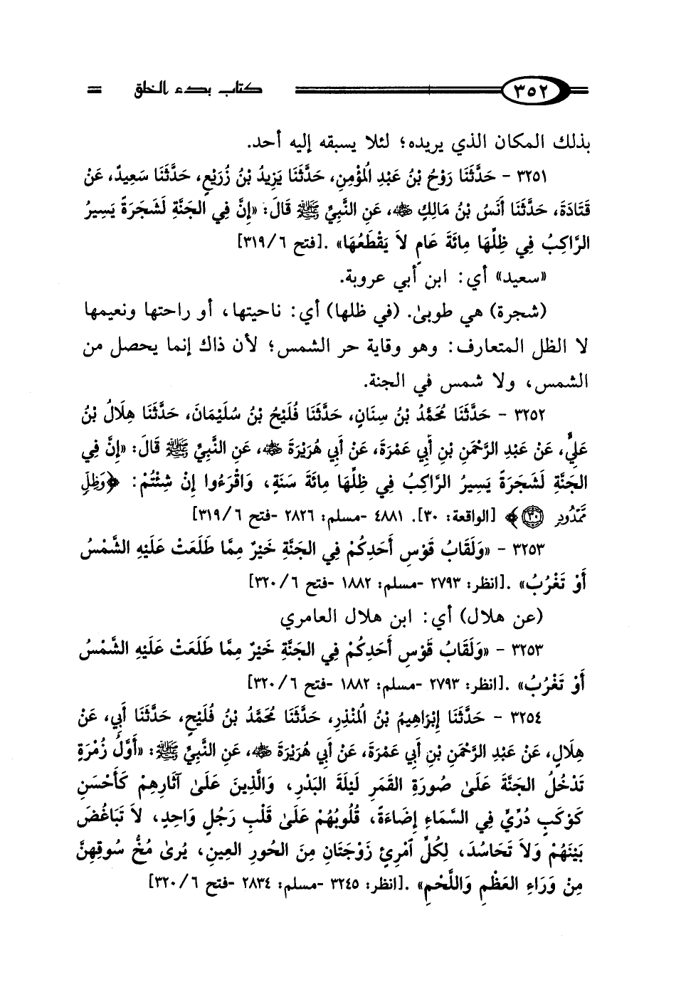 3251 - حَدَّثَنَا رَوْحُ بْنُ عَبْدِ المُؤْمِنِ، حَدَّثَنَا يَزِيدُ بْنُ زُرَيْعٍ، حَدَّثَنَا سَعِيدٌ، عَنْ قَتَادَةَ، حَدَّثَنَا أَنَسُ بْنُ مَالِكٍ رَضِيَ اللَّهُ عَنْهُ، عَنِ النَّبِيِّ صَلَّى اللهُ عَلَيْهِ وَسَلَّمَ، قَال: "إِنَّ فِي الجَنَّةِ لَشَجَرَةً يَسِيرُ الرَّاكِبُ فِي ظِلِّهَا مِائَةَ عَامٍ لَا يَقْطَعُهَا".