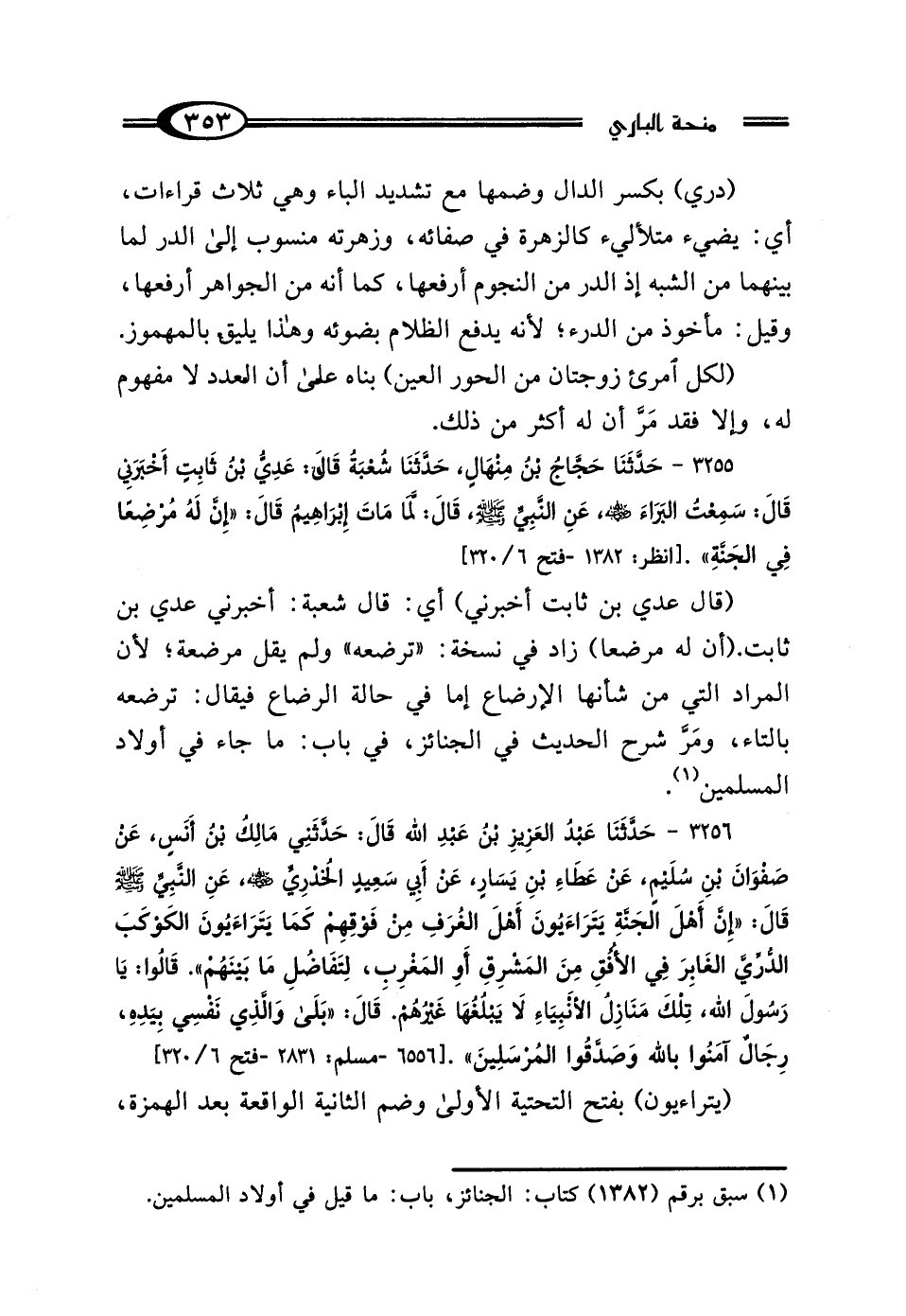 3255 - حَدَّثَنَا حَجَّاجُ بْنُ مِنْهَالٍ، حَدَّثَنَا شُعْبَةُ، قَال عَدِيُّ بْنُ ثَابِتٍ: أَخْبَرَنِي قَال: سَمِعْتُ البَرَاءَ رَضِيَ اللَّهُ عَنْهُ، عَنِ النَّبِيِّ صَلَّى اللهُ عَلَيْهِ وَسَلَّمَ قَال: لَمَّا مَاتَ إِبْرَاهِيمُ قَال: "إِنَّ لَهُ مُرْضِعًا فِي الجَنَّةِ".