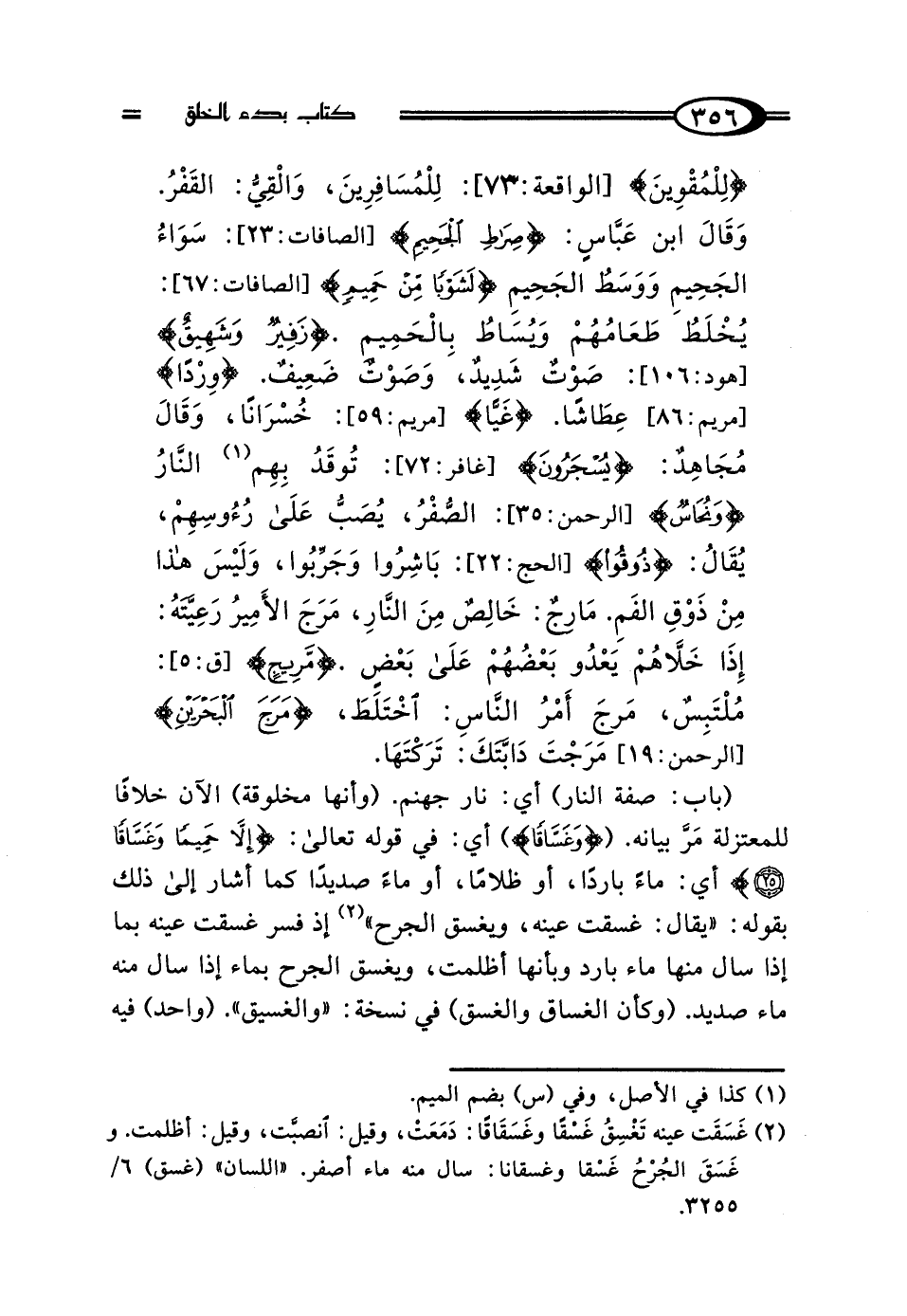 (باب: صفة النار) أي: نار جهنم. (وأنها مخلوقة) الآن خلافًا للمعتزلة مَرَّ بيانه. ({وَغَسَّاقًا}) أي: في قوله تعالى: {إلا حَمِيمًا وَغَسَّاقًا (25)} أي: ماءً باردًا، أو ظلامًا، أو ماءً صديدًا كما أشار إلى ذلك بقوله: "يقال: غسقت عينه، ويغسق الجرح" (¬2) إذ فسر غسقت عينه بما إذا سال منها ماء بارد وبأنها أظلمت، ويغسق الجرح بماء إذا سال منه ماء صديد. (وكأن الغساق والغسق) في نسخة: "والغسيق". (واحد) فيه