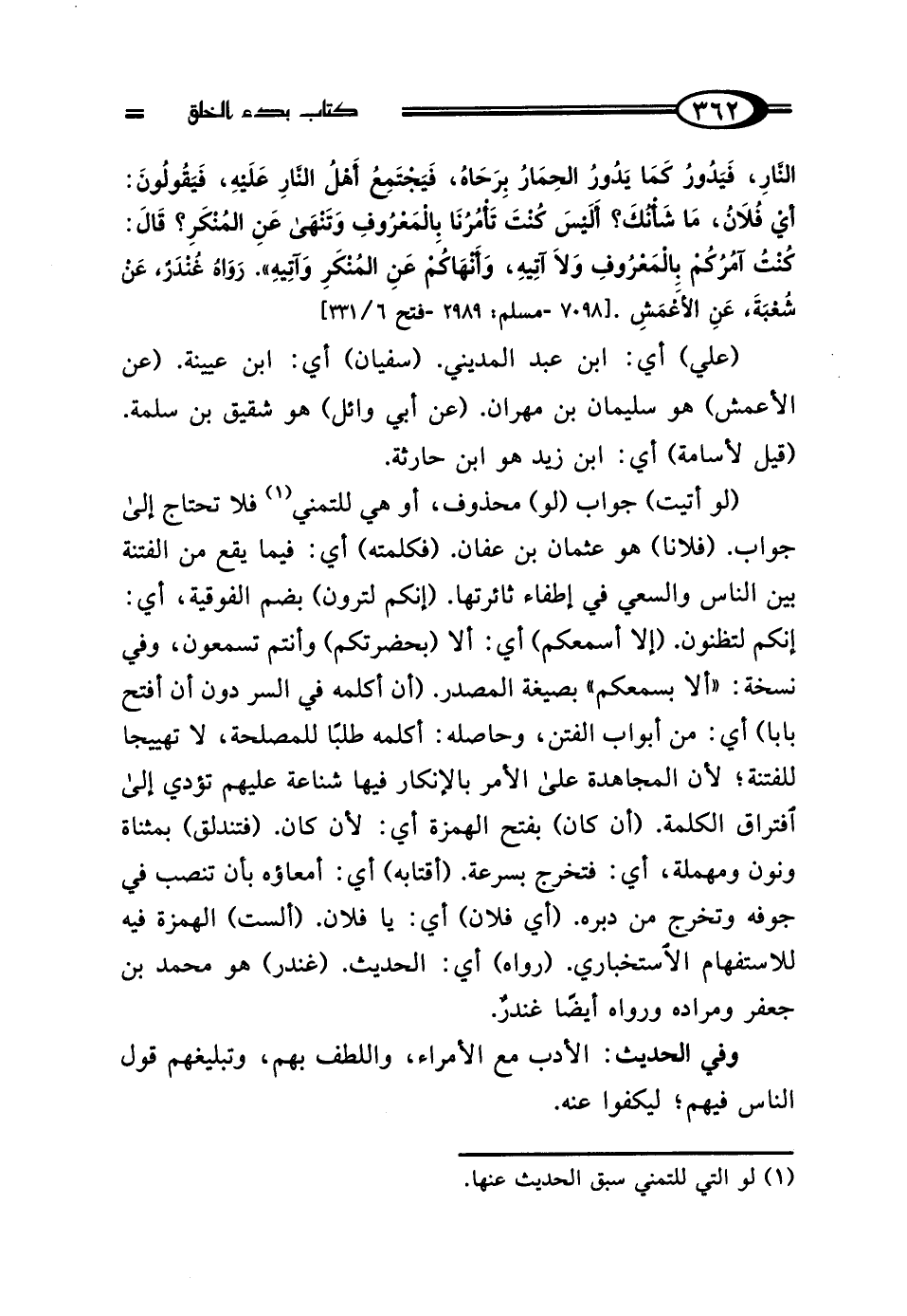 (لو أتيت) جواب (لو) محذوف، أو هي للتمني (¬1) فلا تحتاج إلى جواب. (فلانًا) هو عثمان بن عفان. (فكلمته) أي: فيما يقع من الفتنة بين الناس والسعي في إطفاء ثائرتها. (إنكم لترون) بضم الفوقية، أي: إنكم لتظنون. (إلا أسمعكم) أي: ألا (بحضرتكم) وأنتم تسمعون، وفي نسخة: "ألا بسمعكم" بصيغة المصدر. (أن أكلمه في السر دون أن أفتح بابًا) أي: من أبواب الفتن، وحاصله: أكلمه طلبًا للمصلحة، لا تهييجا للفتنة؛ لأن المجاهدة على الأمر بالإنكار فيها شناعة عليهم تؤدي إلى افتراق الكلمة. (أن كان) بفتح الهمزة أي: لأن كان. (فتندلق) بمثناة ونون ومهملة، أي: فتخرج بسرعة. (أقتابه) أي: أمعاؤه بأن تنصب في جوفه وتخرج من دبره. (أي فلان) أي: يا فلان. (ألست) الهمزة فيه للاستفهام الاستخباري. (رواه) أي: الحديث. (غندر) هو محمد بن جعفر ومراده ورواه أيضًا غندرٌ.