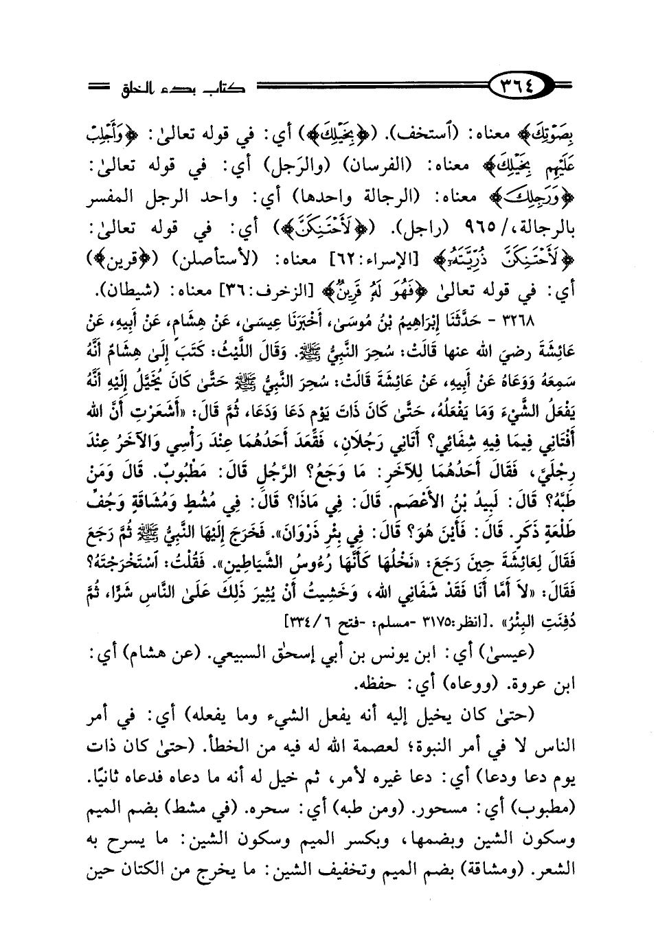 3268 - حَدَّثَنَا إِبْرَاهِيمُ بْنُ مُوسَى، أَخْبَرَنَا عِيسَى، عَنْ هِشَامٍ، عَنْ أَبِيهِ، عَنْ عَائِشَةَ رَضِيَ اللَّهُ عَنْهَا، قَالتْ: سُحِرَ النَّبِيُّ صَلَّى اللهُ عَلَيْهِ وَسَلَّمَ، وَقَال اللَّيْثُ: كَتَبَ إِلَيَّ هِشَامٌ أَنَّهُ سَمِعَهُ وَوَعَاهُ عَنْ أَبِيهِ، عَنْ عَائِشةَ قَالتْ: سُحِرَ النَّبِيُّ صَلَّى اللهُ عَلَيْهِ وَسَلَّمَ، حَتَّى كَانَ يُخَيَّلُ إِلَيْهِ أَنَّهُ يَفْعَلُ الشَّيْءَ وَمَا يَفْعَلُهُ، حَتَّى كَانَ ذَاتَ يَوْمٍ دَعَا وَدَعَا، ثُمَّ قَال: "أَشَعَرْتِ أَنَّ اللَّهَ أَفْتَانِي فِيمَا فِيهِ شِفَائِي، أَتَانِي رَجُلانِ: فَقَعَدَ أَحَدُهُمَا عِنْدَ رَأْسِي وَالآخَرُ عِنْدَ رِجْلَيَّ، فَقَال أَحَدُهُمَا لِلْآخَرِ مَا وَجَعُ الرَّجُلِ؟ قَال: مَطْبُوبٌ، قَال: وَمَنْ طَبَّهُ؟ قَال لَبِيدُ بْنُ الأَعْصَمِ، قَال: فِيمَا ذَا، قَال: فِي مُشُطٍ وَمُشَاقَةٍ وَجُفِّ طَلْعَةٍ ذَكَرٍ، قَال فَأَيْنَ هُوَ؟ قَال: فِي بِئْرِ ذَرْوَانَ " فَخَرَجَ إِلَيْهَا النَّبِيُّ صَلَّى اللهُ عَلَيْهِ وَسَلَّمَ، ثُمَّ رَجَعَ فَقَال لِعَائِشَةَ حِينَ رَجَعَ: "نَخْلُهَا كَأَنَّهُ رُءُوسُ الشَّيَاطِينِ" فَقُلْتُ اسْتَخْرَجْتَهُ؟ فَقَال: "لَا، أَمَّا أَنَا فَقَدْ شَفَانِي اللَّهُ، وَخَشِيتُ أَنْ يُثِيرَ ذَلِكَ عَلَى النَّاسِ شَرًّا" ثُمَّ دُفِنَتِ البِئْرُ.