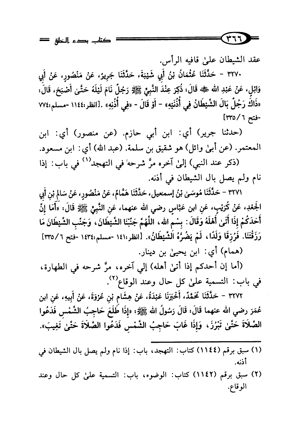 3270 - حَدَّثَنَا عُثْمَانُ بْنُ أَبِي شَيْبَةَ، حَدَّثَنَا جَرِيرٌ، عَنْ مَنْصُورٍ، عَنْ أَبِي وَائِلٍ، عَنْ عَبْدِ اللَّهِ رَضِيَ اللَّهُ عَنْهُ، قَال: ذُكِرَ عِنْدَ النَّبِيِّ صَلَّى اللهُ عَلَيْهِ وَسَلَّمَ رَجُلٌ نَامَ لَيْلَهُ حَتَّى أَصْبَحَ، قَال: "ذَاكَ رَجُلٌ بَال الشَّيْطَانُ فِي أُذُنَيْهِ، أَوْ قَال: فِي أُذُنِهِ".