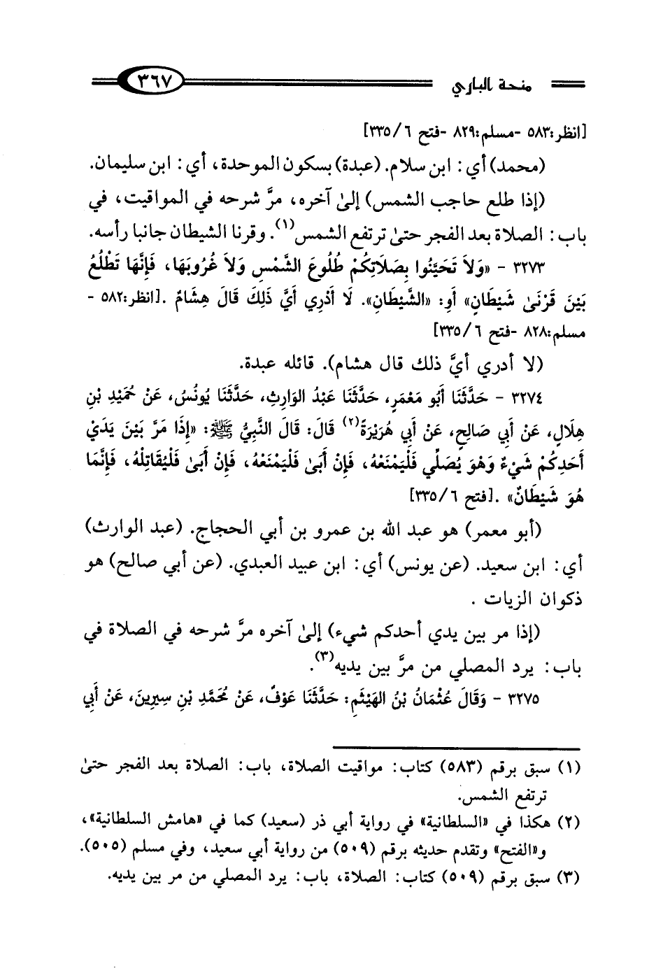 3273 - وَلَا تَحَيَّنُوا بِصَلاتِكُمْ طُلُوعَ الشَّمْسِ وَلَا غُرُوبَهَا، فَإِنَّهَا تَطْلُعُ بَيْنَ قَرْنَيْ شَيْطَانٍ، أَو الشَّيْطَانِ" لَا أَدْرِي أَيَّ ذَلِكَ، قَال هِشَامٌ.