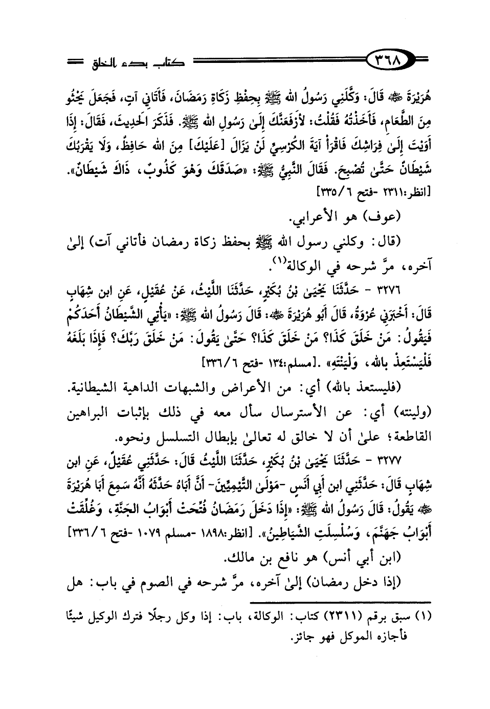 3276 - حَدَّثَنَا يَحْيَى بْنُ بُكَيْرٍ، حَدَّثَنَا اللَّيْثُ، عَنْ عُقَيْلٍ، عَنِ ابْنِ شِهَابٍ، قَال: أَخْبَرَنِي عُرْوَةُ بْنُ الزُّبَيْرِ، قَال أَبُو هُرَيْرَةَ رَضِيَ اللَّهُ عَنْهُ: قَال رَسُولُ اللَّهِ صَلَّى اللهُ عَلَيْهِ وَسَلَّمَ: "يَأْتِي الشَّيْطَانُ أَحَدَكُمْ فَيَقُولُ: مَنْ خَلَقَ كَذَا، مَنْ خَلَقَ كَذَا، حَتَّى يَقُولَ: مَنْ خَلَقَ رَبَّكَ؟ فَإِذَا بَلَغَهُ فَلْيَسْتَعِذْ بِاللَّهِ وَلْيَنْتَهِ".