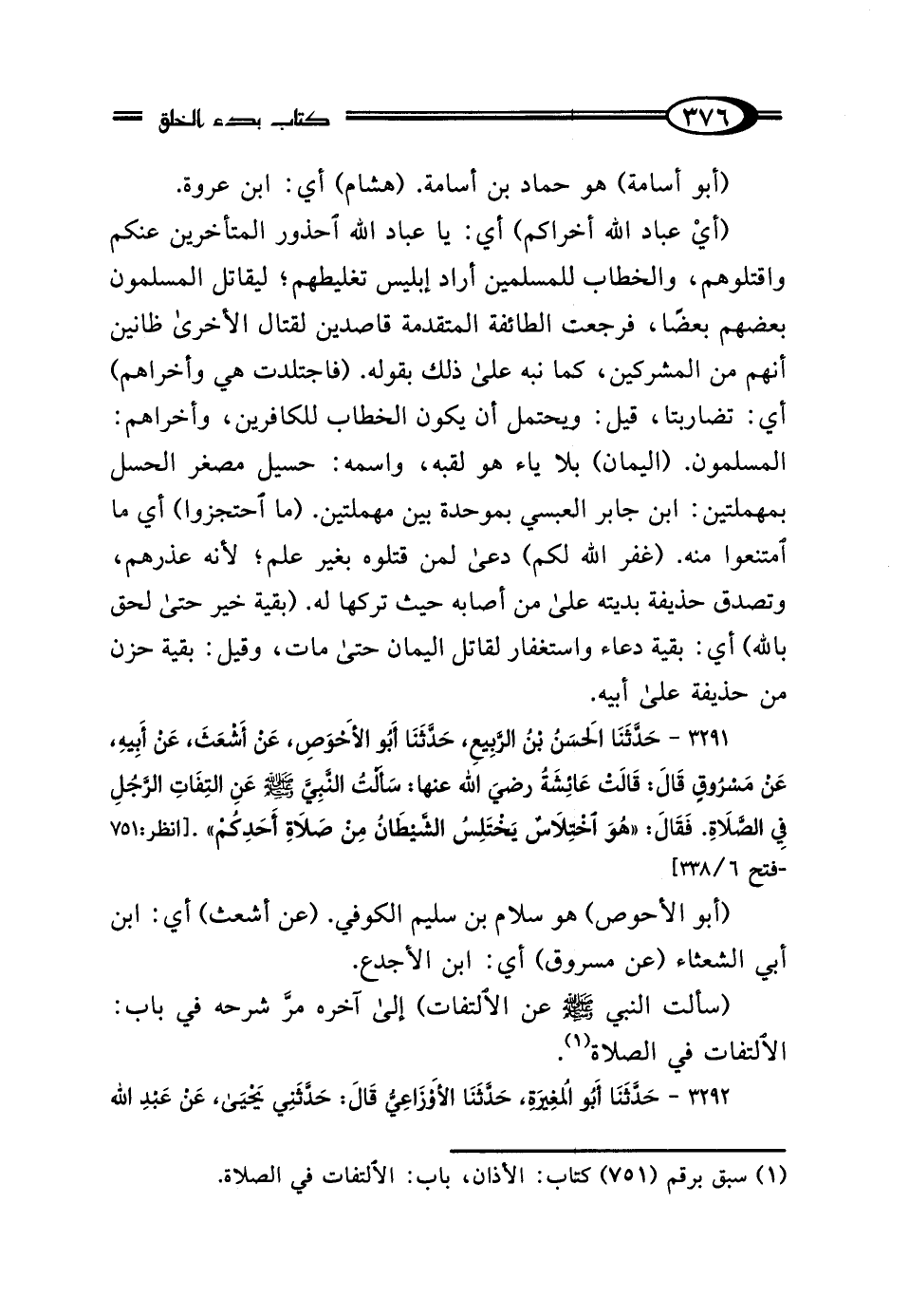 (أي عباد الله أخراكم) أي: يا عباد الله احذور المتأخرين عنكم واقتلوهم، والخطاب للمسلمين أراد إبليس تغليطهم؛ ليقاتل المسلمون بعضهم بعضًا، فرجعت الطائفة المتقدمة قاصدين لقتال الأخرى ظانين أنهم من المشركين، كما نبه على ذلك بقوله. (فاجتلدت هي وأخراهم) أي: تضاربتا، قيل: ويحتمل أن يكون الخطاب للكافرين، وأخراهم: المسلمون. (اليمان) بلا ياء هو لقبه، واسمه: حسيل مصغر الحسل بمهملتين: ابن جابر العبسي بموحدة بين مهملتين. (ما احتجزوا) أي بها امتنعوا منه. (غفر الله لكم) دعى لمن قتلوه بغير علم؛ لأنه عذرهم، وتصدق حذيفة بديته على من أصابه حيث تركها له. (بقية خير حتى لحق بالله) أي: بقية دعاء واستغفار لقاتل اليمان حتى مات، وقيل: بقية حزن من حذيفة على أبيه.