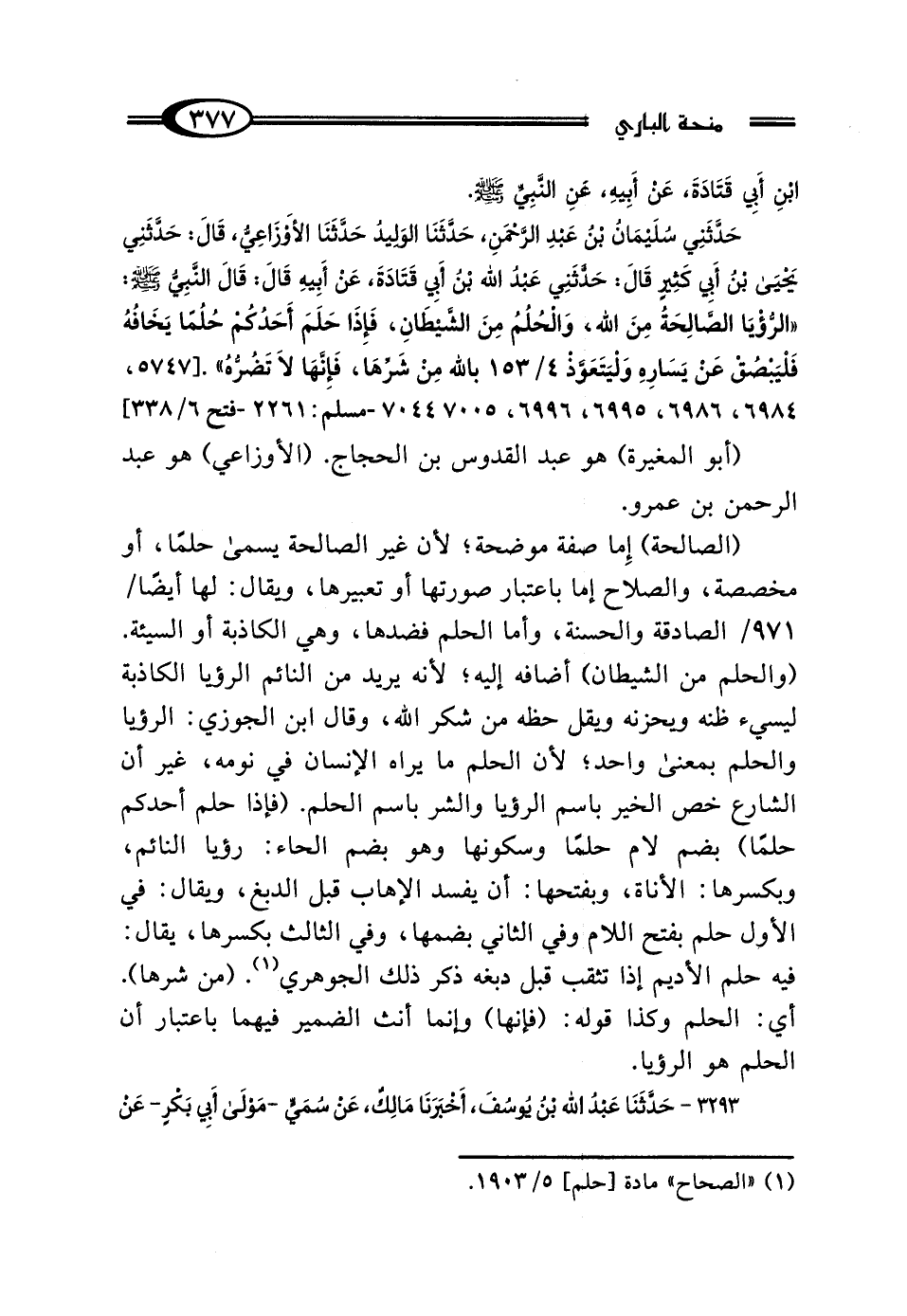 بْنِ أَبِي قَتَادَةَ، عَنْ أَبِيهِ، عَنِ النَّبِيِّ صَلَّى اللهُ عَلَيْهِ وَسَلَّمَ ح وحَدَّثَنِي سُلَيْمَانُ بْنُ عَبْدِ الرَّحْمَنِ، حَدَّثَنَا الوَلِيدُ، حَدَّثَنَا الأَوْزَاعِيُّ، قَال: حَدَّثَنِي يَحْيَى بْنُ أَبِي كَثِيرٍ، قَال: حَدَّثَنِي عَبْدُ اللَّهِ بْنُ أَبِي قَتَادَةَ، عَنْ أَبِيهِ قَال: قَال النَّبِيُّ صَلَّى اللهُ عَلَيْهِ وَسَلَّمَ: "الرُّؤْيَا الصَّالِحَةُ مِنَ اللَّهِ، وَالحُلُمُ مِنَ الشَّيْطَانِ، فَإِذَا حَلَمَ أَحَدُكُمْ حُلُمًا يَخَافُهُ فَلْيَبْصُقْ عَنْ يَسَارِهِ، وَلْيَتَعَوَّذْ بِاللَّهِ مِنْ شَرِّهَا، فَإِنَّهَا لَا تَضُرُّهُ".