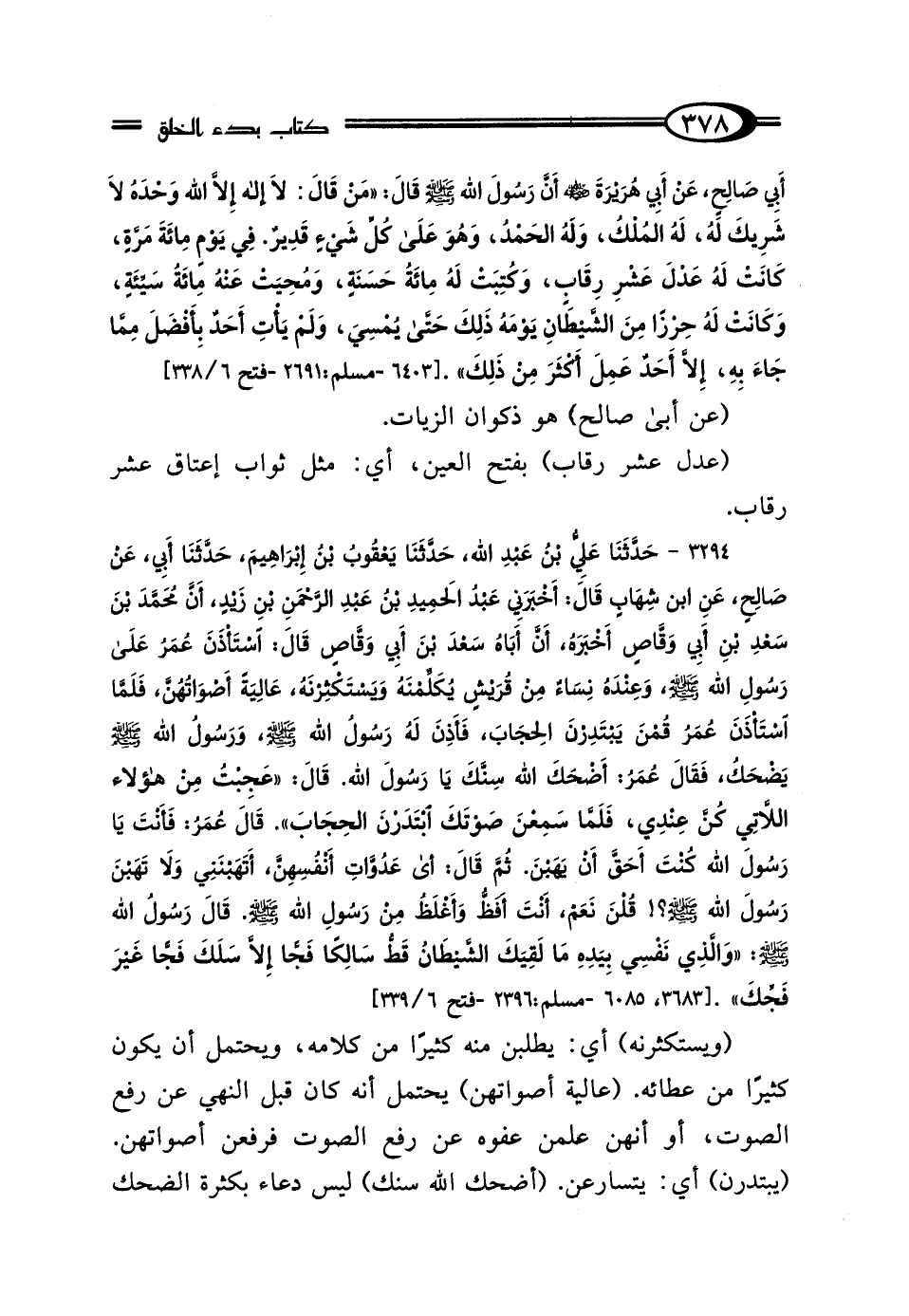 أَبِي صَالِحٍ، عَنْ أَبِي هُرَيْرَةَ رَضِيَ اللَّهُ عَنْهُ، أَنَّ رَسُولَ اللَّهِ صَلَّى اللهُ عَلَيْهِ وَسَلَّمَ، قَال: "مَنْ قَال: لَا إِلَهَ إلا اللَّهُ، وَحْدَهُ لَا شَرِيكَ لَهُ، لَهُ المُلْكُ وَلَهُ الحَمْدُ، وَهُوَ عَلَى كُلِّ شَيْءٍ قَدِيرٌ، فِي يَوْمٍ مِائَةَ مَرَّةٍ، كَانَتْ لَهُ عَدْلَ عَشْرِ رِقَابٍ، وَكُتِبَتْ لَهُ مِائَةُ حَسَنَةٍ، وَمُحِيَتْ عَنْهُ مِائَةُ سَيِّئَةٍ، وَكَانَتْ لَهُ حِرْزًا مِنَ الشَّيْطَانِ يَوْمَهُ ذَلِكَ حَتَّى يُمْسِيَ، وَلَمْ يَأْتِ أَحَدٌ بِأَفْضَلَ مِمَّا جَاءَ بِهِ، إلا أَحَدٌ عَمِلَ أَكْثَرَ مِنْ ذَلِكَ".