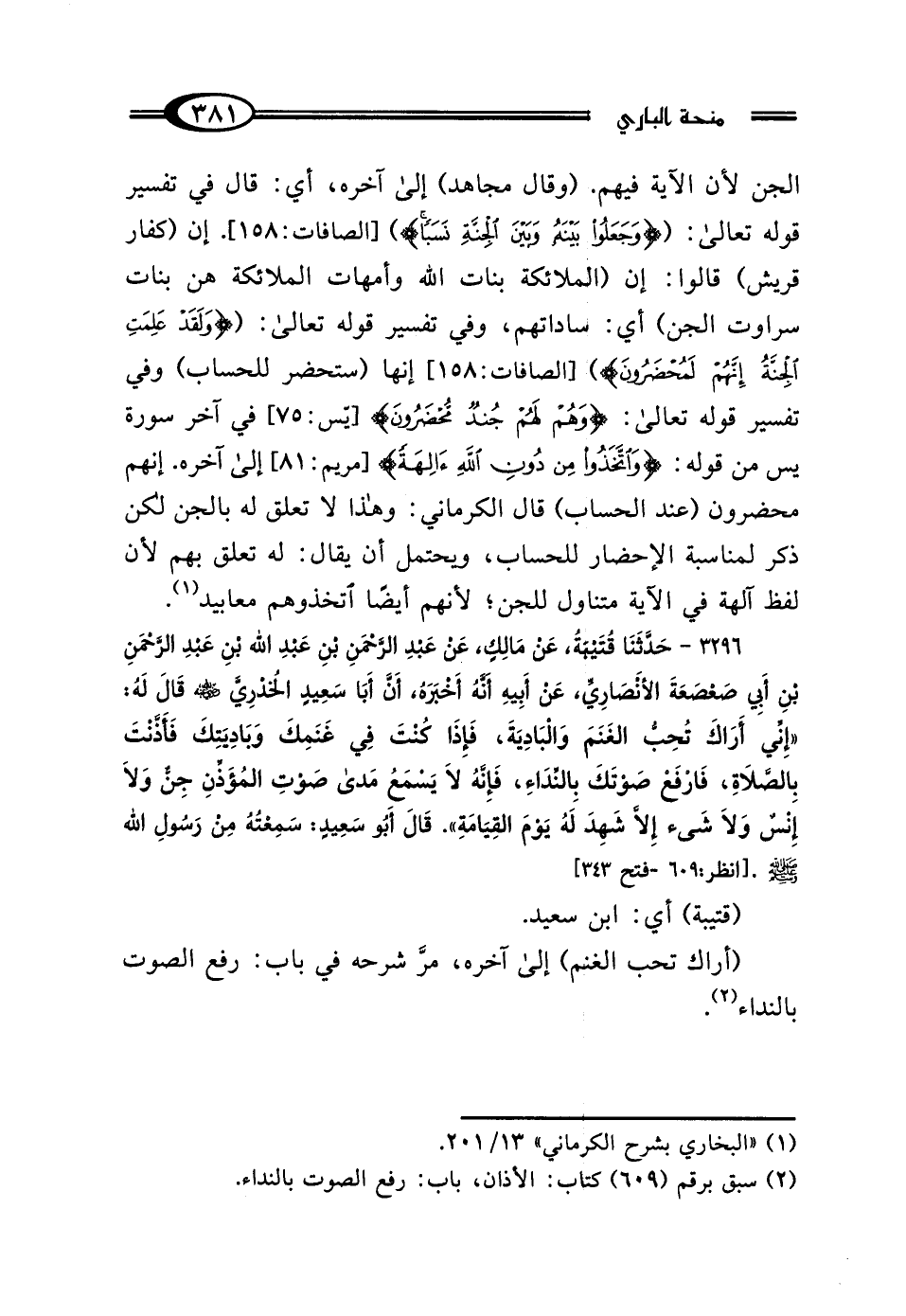 الجن لأن الآية فيهم. (وقال مجاهد) إلى آخره، أي: قال في تفسير قوله تعالى: {وَجَعَلُوا بَيْنَهُ وَبَيْنَ الْجِنَّةِ نَسَبًا} [الصافات: 158]. إن (كفار قريش) قالوا: إن (الملائكة بنات الله وأمهات الملائكة هن بنات سراوت الجن) أي: ساداتهم، وفي تفسير قوله تعالى: {وَلَقَدْ عَلِمَتِ الْجِنَّةُ إِنَّهُمْ لَمُحْضَرُونَ} [الصافات: 158] إنها (ستحضر للحساب) وفي تفسير قوله تعالى: {وَهُمْ لَهُمْ جُنْدٌ مُحْضَرُونَ} [يس: 75] في آخر سورة يس من قوله: {وَاتَّخَذُوا مِنْ دُونِ اللَّهِ آلِهَةً} [مريم: 81] إلى آخره. إنهم محضرون (عند الحساب) قال الكرماني: وهذا لا تعلق له بالجن لكن ذكر لمناسبة الإحضار للحساب، ويحتمل أن يقال: له تعلق بهم لأن لفظ آلهة في الآية متناول للجن، لأنهم أيضًا اتخذوهم معابيد (¬1).