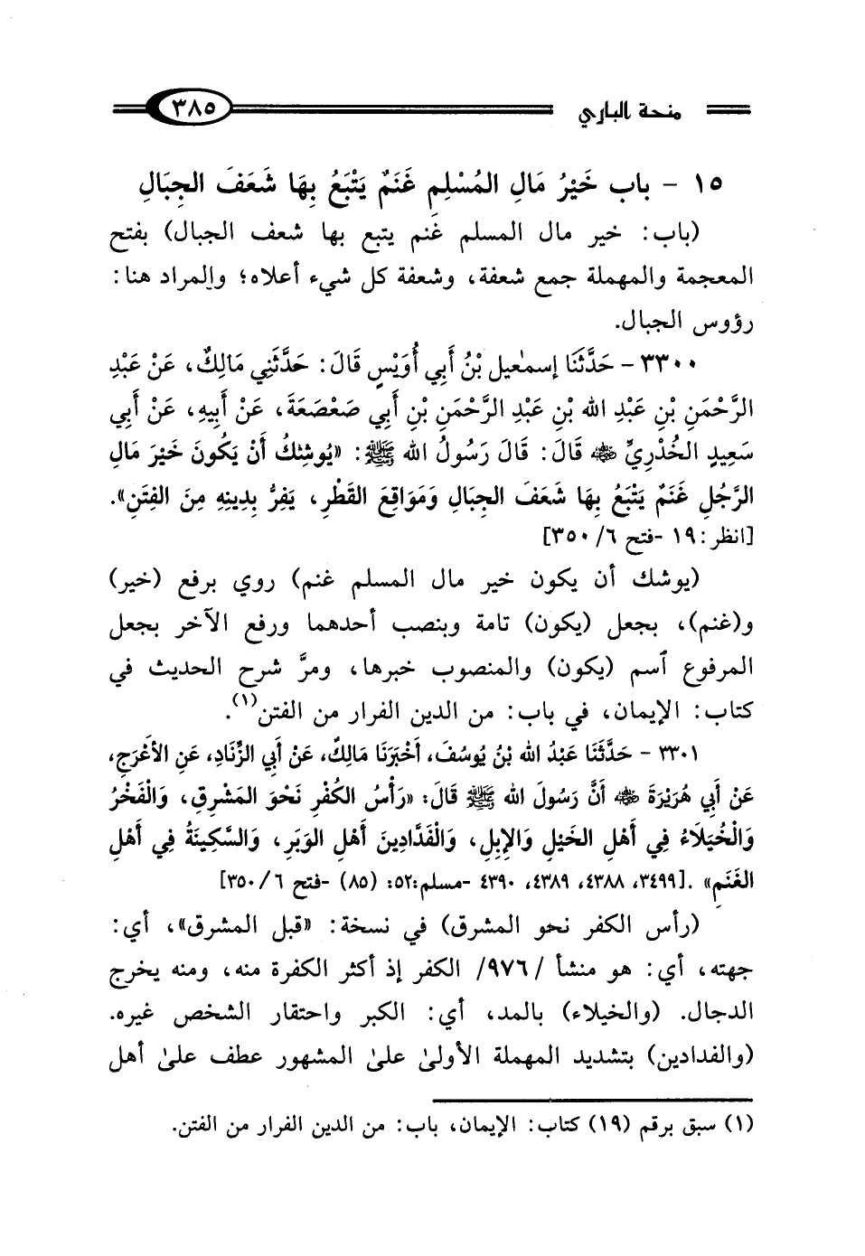 3300 - حَدَّثَنَا إِسْمَاعِيلُ بْنُ أَبِي أُوَيْسٍ، قَال حَدَّثَنِي مَالِكٌ، عَنْ عَبْدِ الرَّحْمَنِ بْنِ عَبْدِ اللَّهِ بْنِ عَبْدِ الرَّحْمَنِ بْنِ أَبِي صَعْصَعَةَ، عَنْ أَبِيهِ، عَنْ أَبِي سَعِيدٍ الخُدْرِيِّ رَضِيَ اللَّهُ عَنْهُ، قَال: قَال رَسُولُ اللَّهِ صَلَّى اللهُ عَلَيْهِ وَسَلَّمَ: "يُوشِكَ أَنْ يَكُونَ خَيْرَ مَالِ الرَّجُلِ غَنَمٌ، يَتْبَعُ بِهَا شَعَفَ الجِبَالِ وَمَوَاقِعَ القَطْرِ، يَفِرُّ بِدِينِهِ مِنَ الفِتَنِ".