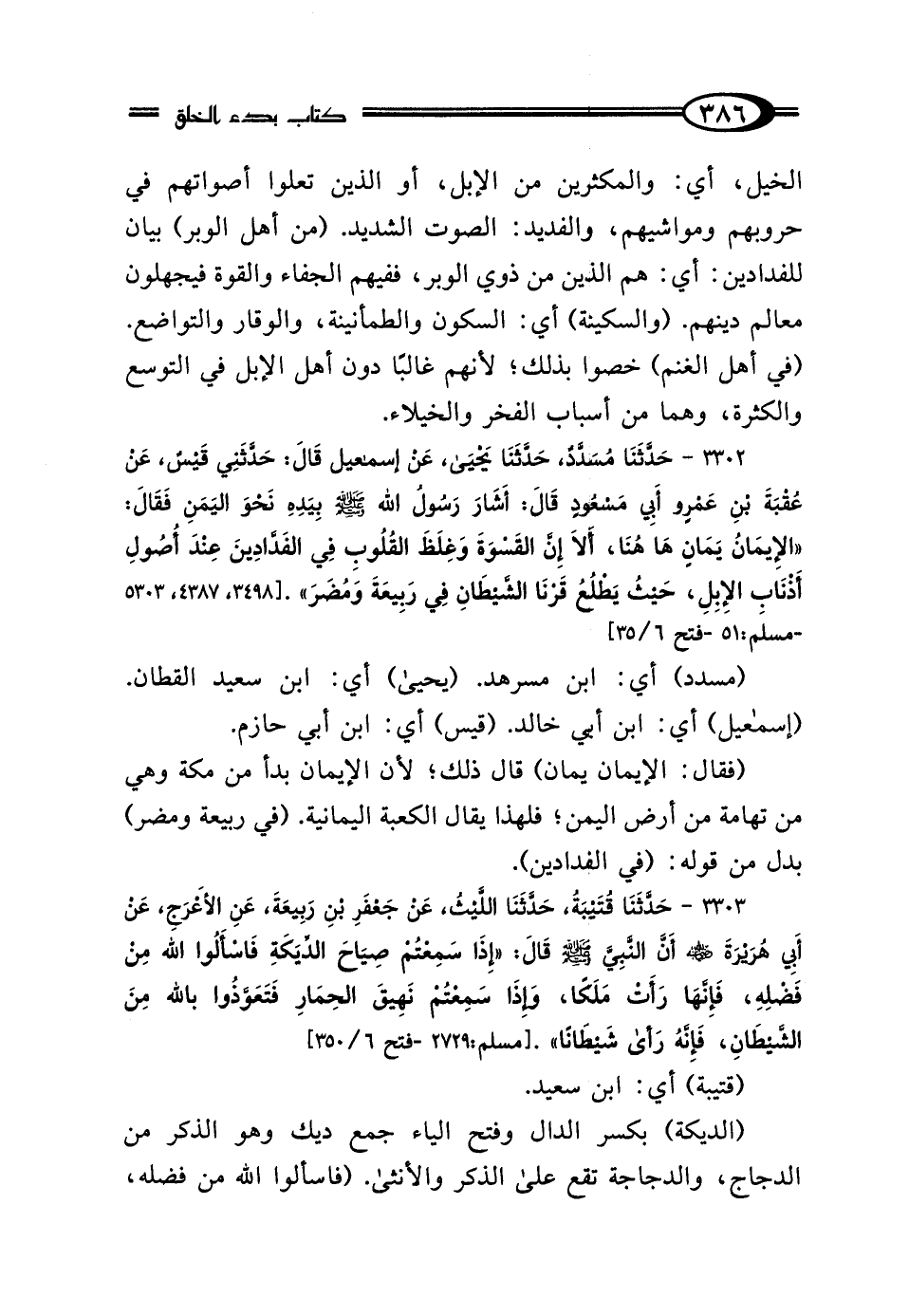 3302 - حَدَّثَنَا مُسَدَّدٌ، حَدَّثَنَا يَحْيَى، عَنْ إِسْمَاعِيلَ، قَال: حَدَّثَنِي قَيْسٌ، عَنْ عُقْبَةَ بْنِ عَمْرٍو أَبِي مَسْعُودٍ، قَال: أَشَارَ رَسُولُ اللَّهِ صَلَّى اللهُ عَلَيْهِ وَسَلَّمَ بِيَدِهِ نَحْوَ اليَمَنِ فَقَال "الإِيمَانُ يَمَانٍ هَا هُنَا، أَلا إِنَّ القَسْوَةَ وَغِلَظَ القُلُوبِ فِي الفَدَّادِينَ، عِنْدَ أُصُولِ أَذْنَابِ الإِبِلِ، حَيْثُ يَطْلُعُ قَرْنَا الشَّيْطَانِ فِي رَبِيعَةَ، وَمُضَرَ".