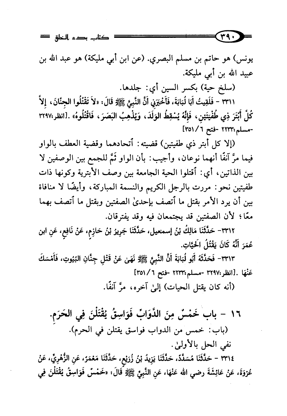 3311 - فَلَقِيتُ أَبَا لُبَابَةَ، فَأَخْبَرَنِي أَنَّ النَّبِيَّ صَلَّى اللهُ عَلَيْهِ وَسَلَّمَ قَال: "لَا تَقْتُلُوا الجِنَّانَ، إلا كُلَّ أَبْتَرَ ذِي طُفْيَتَيْنِ، فَإِنَّهُ يُسْقِطُ الوَلَدَ، وَيُذْهِبُ البَصَرَ فَاقْتُلُوهُ".