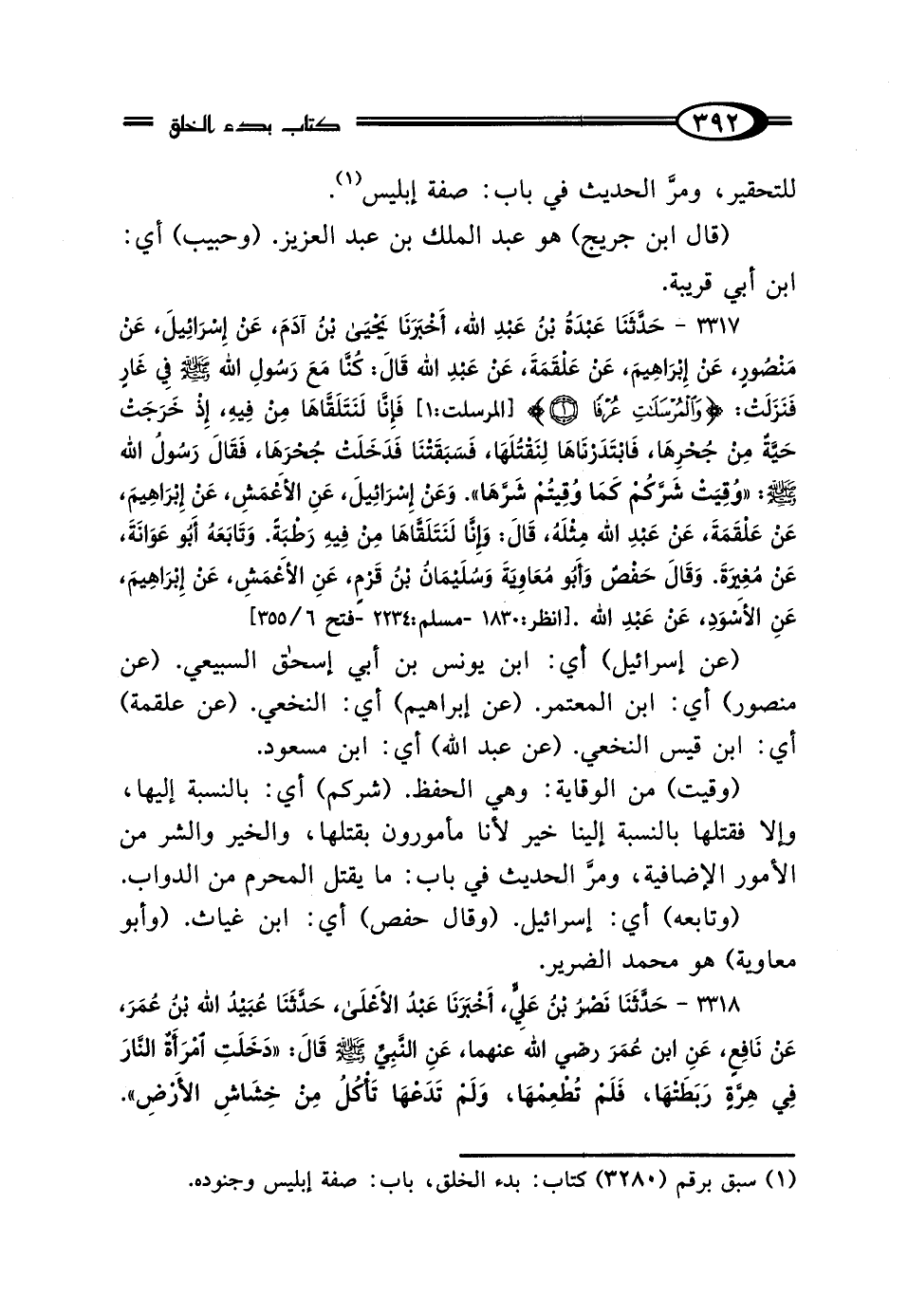3317 - حَدَّثَنَا عَبْدَةُ بْنُ عَبْدِ اللَّهِ، أَخْبَرَنَا يَحْيَى بْنُ آدَمَ، عَنْ إِسْرَائِيلَ، عَنْ مَنْصُورٍ، عَنْ إِبْرَاهِيمَ، عَنْ عَلْقَمَةَ، عَنْ عَبْدِ اللَّهِ، قَال: كُنَّا مَعَ رَسُولِ اللَّهِ صَلَّى اللهُ عَلَيْهِ وَسَلَّمَ فِي غَارٍ، فَنَزَلَتْ {وَالمُرْسَلاتِ عُرْفًا} [المرسلات: 1] فَإِنَّا لَنَتَلَقَّاهَا مِنْ فِيهِ، إِذْ خَرَجَتْ حَيَّةٌ مِنْ جُحْرِهَا، فَابْتَدَرْنَاهَا لِنَقْتُلَهَا، فَسَبَقَتْنَا فَدَخَلَتْ جُحْرَهَا، فَقَال رَسُولُ اللَّهِ صَلَّى اللهُ عَلَيْهِ وَسَلَّمَ "وُقِيَتْ شَرَّكُمْ كَمَا وُقِيتُمْ شَرَّهَا" وَعَنْ إِسْرَائِيلَ، عَنِ الأَعْمَشِ، عَنْ إِبْرَاهِيمَ، عَنْ عَلْقَمَةَ، عَنْ عَبْدِ اللَّهِ مِثْلَهُ، قَال: وَإِنَّا لَنَتَلَقَّاهَا مِنْ فِيهِ رَطْبَةً وَتَابَعَهُ أَبُو عَوَانَةَ، عَنْ مُغِيرَةَ، وَقَال: حَفْصٌ، وَأَبُو مُعَاويَةَ، وَسُلَيْمَانُ بْنُ قَرْمٍ، عَنِ الأَعْمَشِ، عَنْ إِبْرَاهِيمَ، عَنِ الأَسْوَدِ، عَنْ عَبْدِ اللَّهِ.
