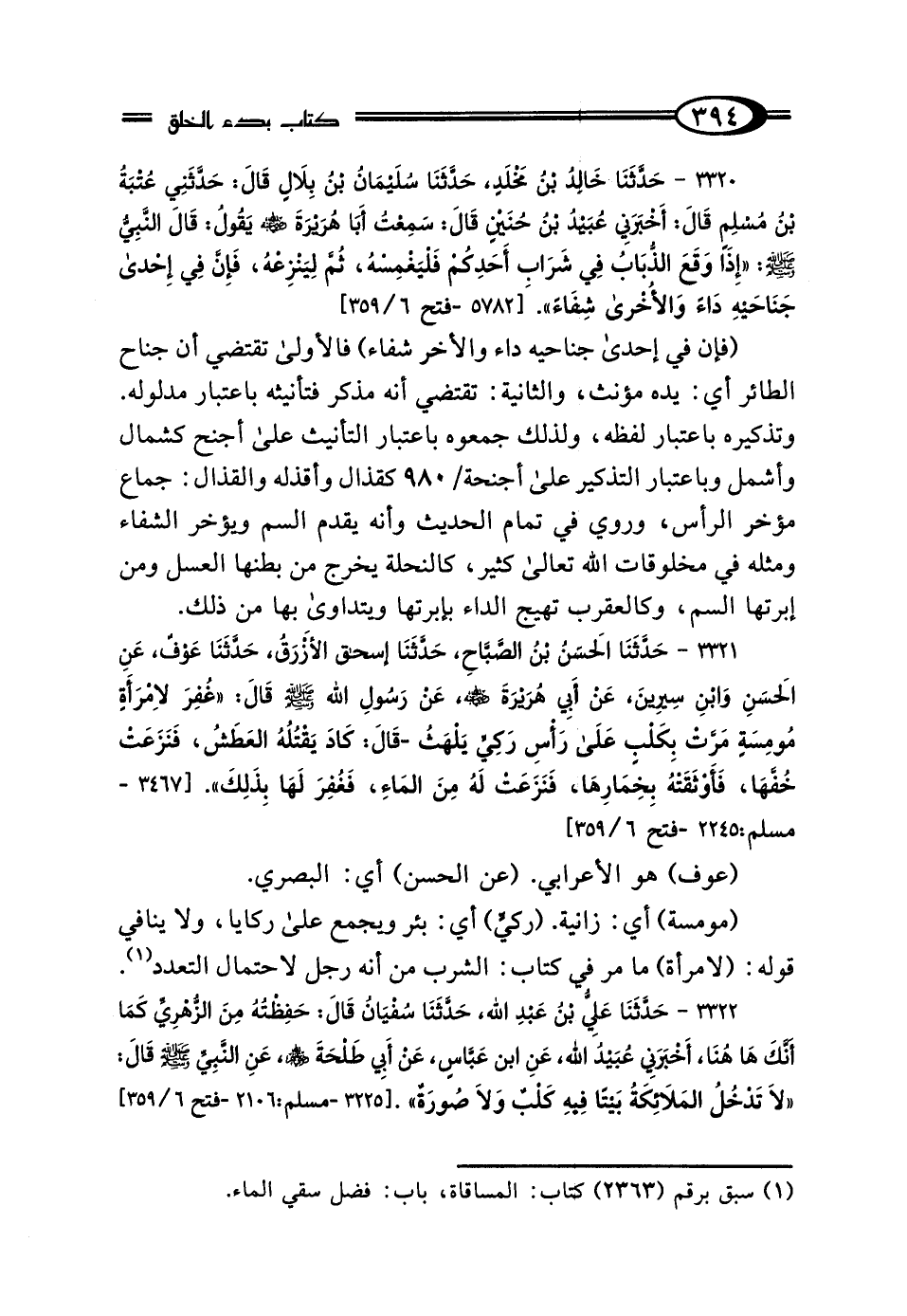 3320 - حَدَّثَنَا خَالِدُ بْنُ مَخْلَدٍ، حَدَّثَنَا سُلَيْمَانُ بْنُ بِلالٍ، قَال: حَدَّثَنِي عُتْبَةُ بْنُ مُسْلِمٍ، قَال: أَخْبَرَنِي عُبَيْدُ بْنُ حُنَيْنٍ، قَال: سَمِعْتُ أَبَا هُرَيْرَةَ رَضِيَ اللَّهُ عَنْهُ، يَقُولُ: قَال النَّبِيُّ صَلَّى اللهُ عَلَيْهِ وَسَلَّمَ: "إِذَا وَقَعَ الذُّبَابُ فِي شَرَابِ أَحَدِكُمْ فَلْيَغْمِسْهُ ثُمَّ لِيَنْزِعْهُ، فَإِنَّ فِي إِحْدَى جَنَاحَيْهِ دَاءً وَالأُخْرَى شِفَاءً".