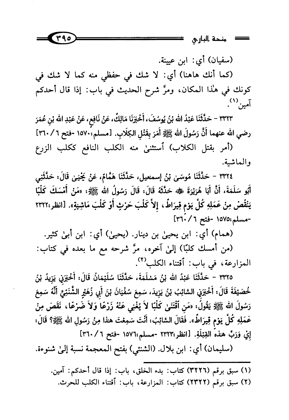 3325 - حَدَّثَنَا عَبْدُ اللَّهِ بْنُ مَسْلَمَةَ، حَدَّثَنَا سُلَيْمَانُ، قَال: أَخْبَرَنِي يَزِيدُ بْنُ خُصَيْفَةَ، قَال: أَخْبَرَنِي السَّائِبُ بْنُ يَزِيدَ، سَمِعَ سُفْيَانَ بْنَ أَبِي زُهَيْرٍ الشَّنَئِيَّ، أَنَّهُ سَمِعَ رَسُولَ اللَّهِ صَلَّى اللهُ عَلَيْهِ وَسَلَّمَ، يَقُولُ "مَنِ اقْتَنَى كَلْبًا، لَا يُغْنِي عَنْهُ زَرْعًا وَلَا ضَرْعًا، نَقَصَ مِنْ عَمَلِهِ كُلَّ يَوْمٍ قِيرَاطٌ" فَقَال السَّائِبُ: أَنْتَ سَمِعْتَ هَذَا مِنْ رَسُولِ اللَّهِ صَلَّى اللهُ عَلَيْهِ وَسَلَّمَ، قَال: إِي وَرَبِّ هَذِهِ القِبْلَةِ.