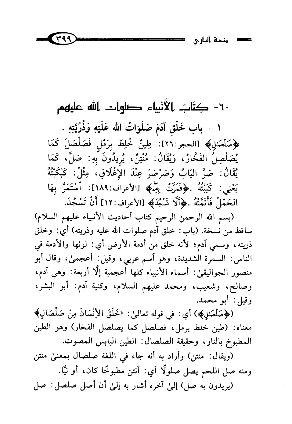 {صَلْصَالٍ} [الحجر: 26]: "طِينٌ خُلِطَ بِرَمْلٍ، فَصَلْصَلَ كَمَا يُصَلْصِلُ الفَخَّارُ، وَيُقَالُ: مُنْتِنٌ، يُرِيدُونَ بِهِ صَلَّ، كَمَا يُقَالُ: صَرَّ البَابُ وَصَرْصَرَ عِنْدَ الإِغْلاقِ، مِثْلُ كَبْكَبْتُهُ يَعْنِي كَبَبْتُهُ"، فَمَرَّتْ بِهِ: "اسْتَمَرَّ بِهَا الحَمْلُ فَأَتَمَّتْهُ"، {أَلَّا تَسْجُدَ} [الأعراف: 12]: "أَنْ تَسْجُدَ".