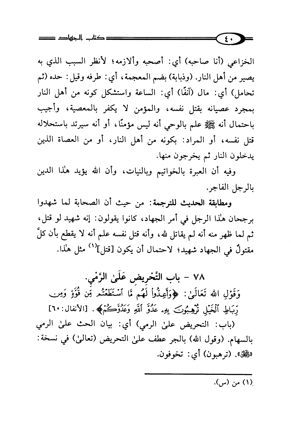ومطابقة الحديث للترجمة: من حيث أن الصحابة لما شهدوا برجحان هذا الرجل في أمر الجهاد، كانوا يقولون: إنه شهيد لو قتل، ثم لما ظهر منه أنه لم يقاتل لله، وأنه قتل نفسه علم أنه لا يقطع بأن كلَّ مقتولٌ في الجهاد شهيد؛ لاحتمال أن يكون [قتل] (¬1) مثل هذا.